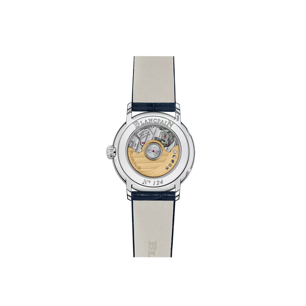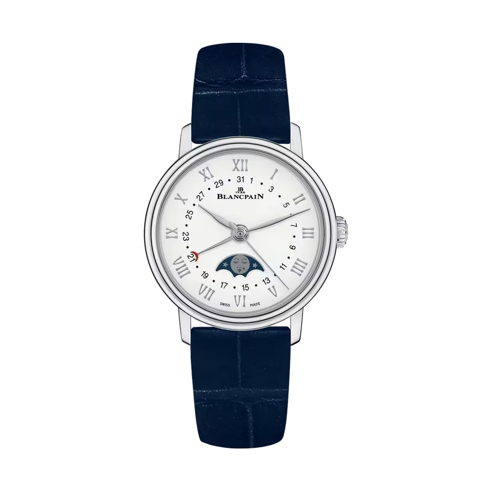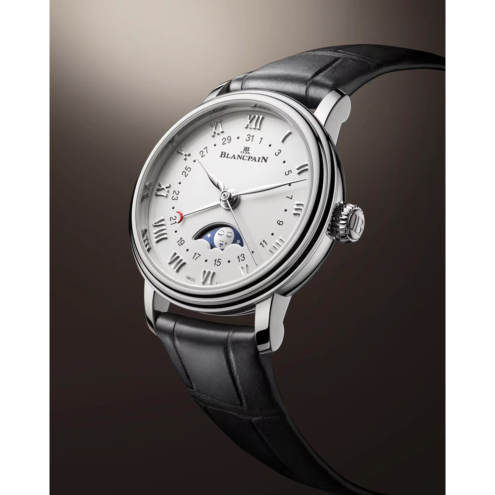 Eine Mondphasenkomplikation verfolgt den 29,5-tägigen Mondzyklus mit einer rotierenden Scheibe unter dem Zifferblatt, die von einem Rad mit 59 Zähnen angetrieben wird. Es verbindet Funktion mit Poesie. Blancpain ist dafür bekannt, dieses Merkmal zu verfeinern und Präzision, Tradition und Eleganz in jeder mondbeschienenen Präsentation zu vereinen.