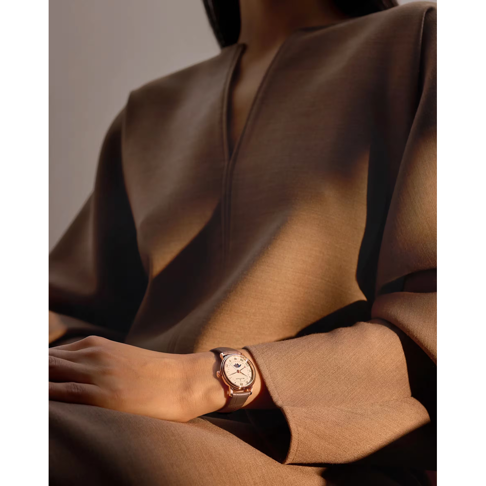 Bei einer Kalenderkomplikation wird ein spezieller Zeiger verwendet, der auf das Datum zeigt und um den Rand des Zifferblatts angeordnet ist. Diese periphere Skala, die in der Regel von 1 bis 31 nummeriert ist, bietet eine schnelle Ablesbarkeit. Sie verleiht traditionellen Zeitmessern einen klassischen, eleganten Touch.