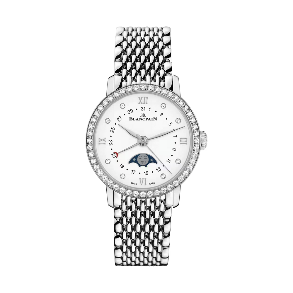 Eine Mondphasenkomplikation verfolgt den 29,5-tägigen Mondzyklus mit einer rotierenden Scheibe unter dem Zifferblatt, die von einem Rad mit 59 Zähnen angetrieben wird. Es verbindet Funktion mit Poesie. Blancpain ist dafür bekannt, dieses Merkmal zu verfeinern und Präzision, Tradition und Eleganz in jeder mondbeschienenen Präsentation zu vereinen.