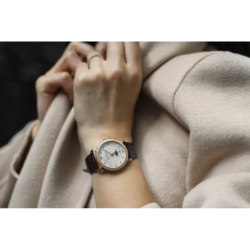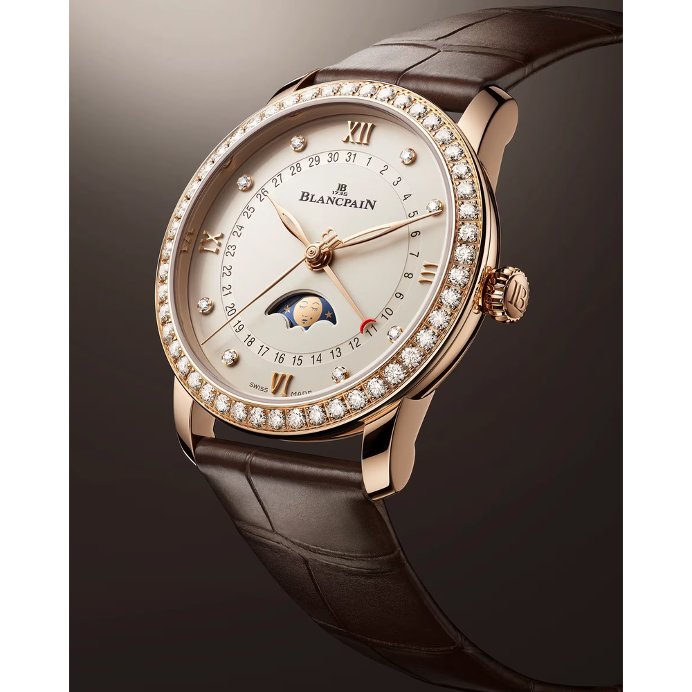 Eine Mondphasenkomplikation verfolgt den 29,5-tägigen Mondzyklus mit einer rotierenden Scheibe unter dem Zifferblatt, die von einem Rad mit 59 Zähnen angetrieben wird. Es verbindet Funktion mit Poesie. Blancpain ist dafür bekannt, dieses Merkmal zu verfeinern und Präzision, Tradition und Eleganz in jeder mondbeschienenen Präsentation zu vereinen.