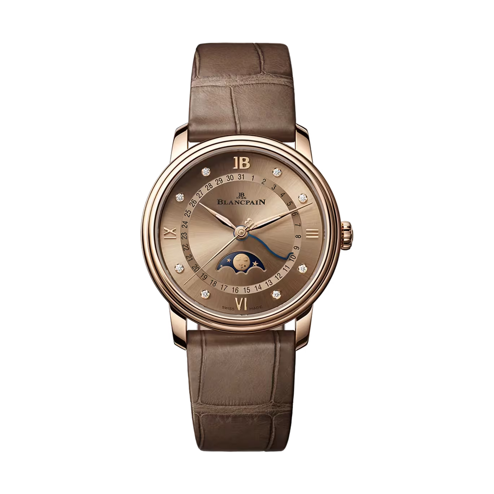 Eine Mondphasenkomplikation verfolgt den 29,5-tägigen Mondzyklus mit einer rotierenden Scheibe unter dem Zifferblatt, die von einem Rad mit 59 Zähnen angetrieben wird. Es verbindet Funktion mit Poesie. Blancpain ist dafür bekannt, dieses Merkmal zu verfeinern und Präzision, Tradition und Eleganz in jeder mondbeschienenen Präsentation zu vereinen.