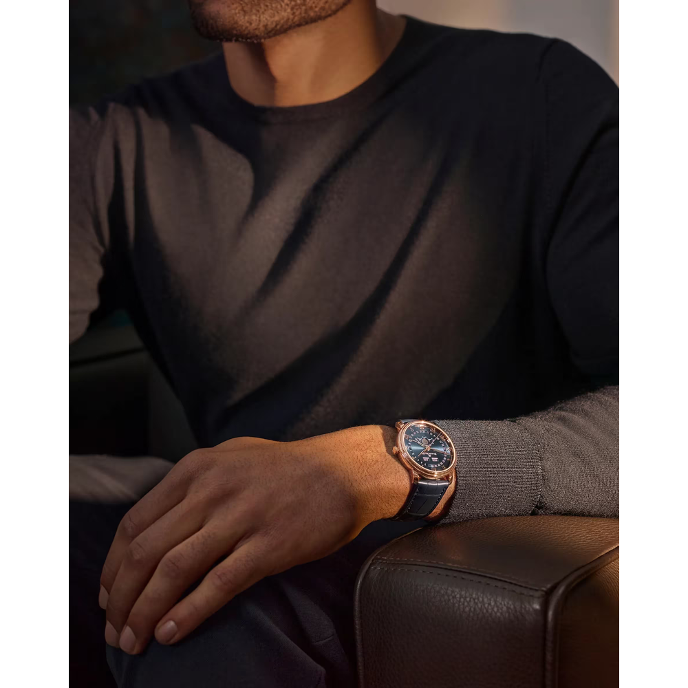 Eine Mondphasenkomplikation verfolgt den 29,5-tägigen Mondzyklus mit einer rotierenden Scheibe unter dem Zifferblatt, die von einem Rad mit 59 Zähnen angetrieben wird. Es verbindet Funktion mit Poesie. Blancpain ist dafür bekannt, dieses Merkmal zu verfeinern und Präzision, Tradition und Eleganz in jeder mondbeschienenen Präsentation zu vereinen.