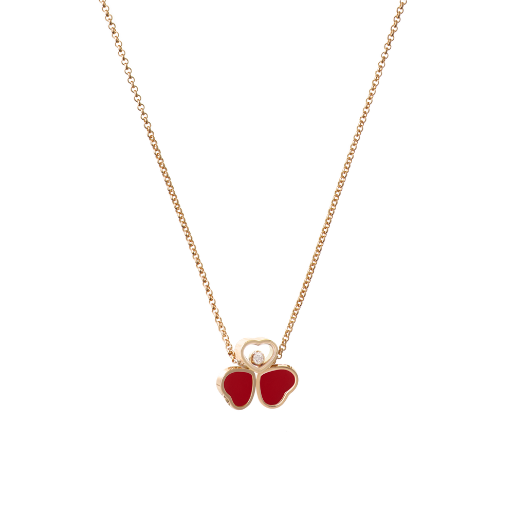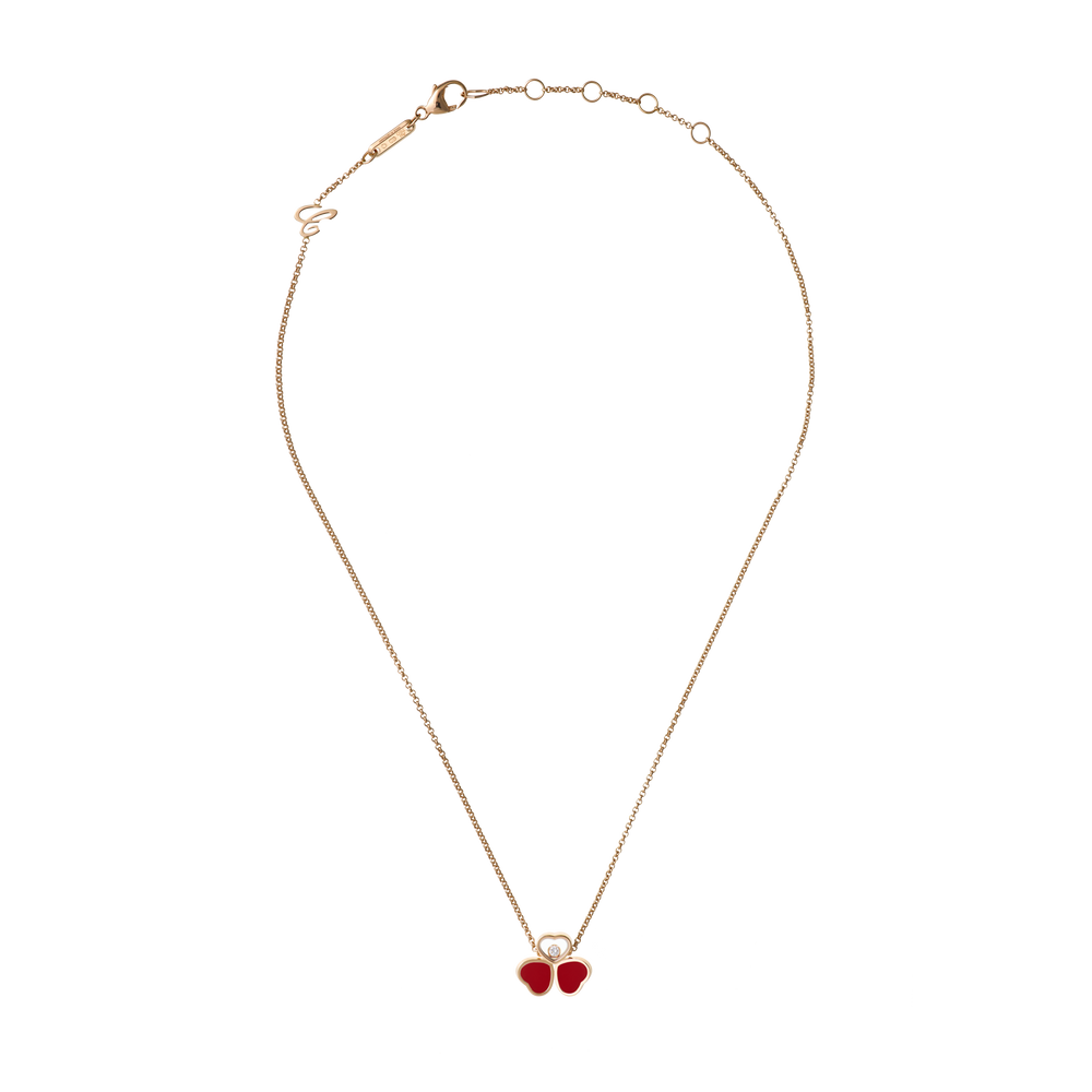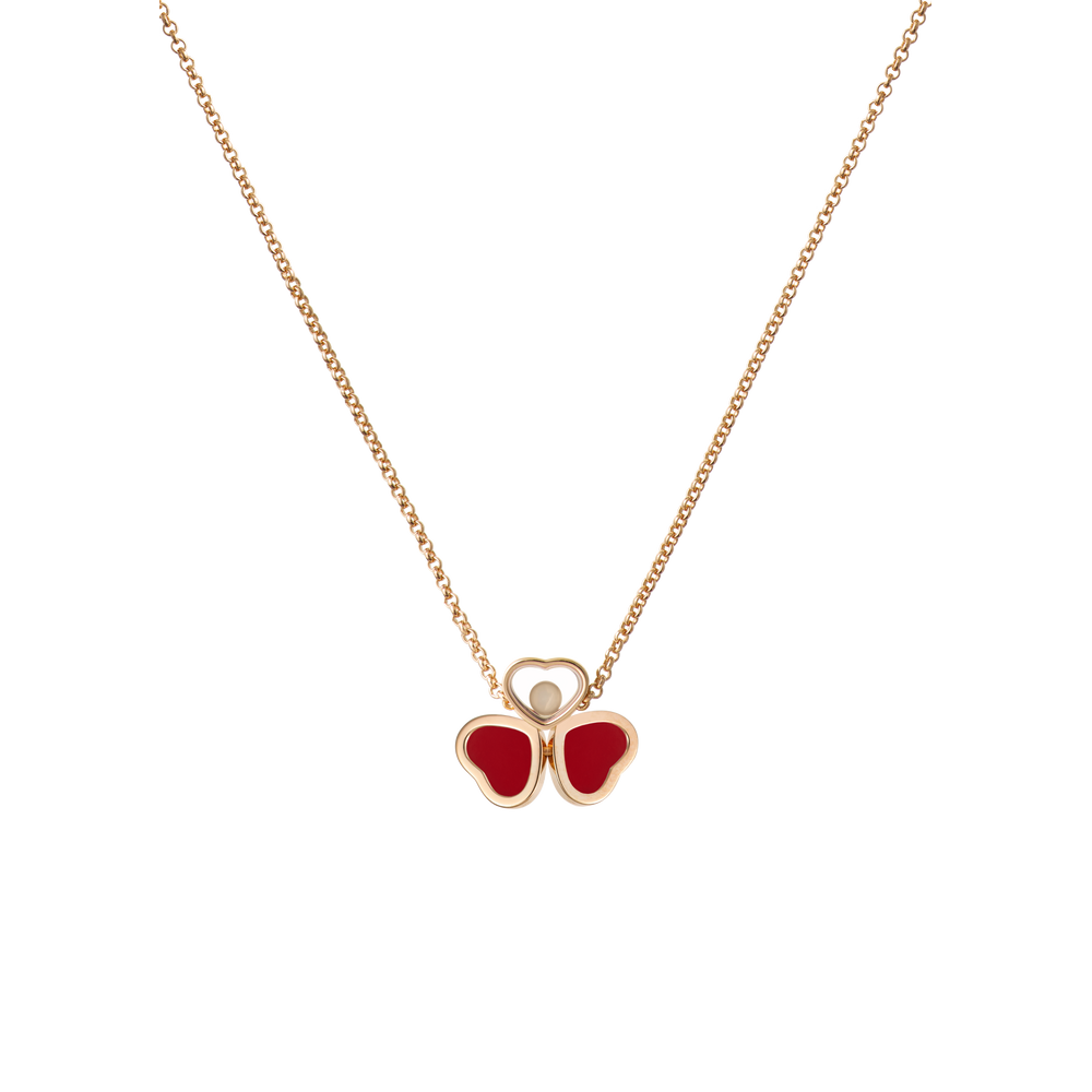 Als Inbegriff der Leichtigkeit hauchte der Schmetterling den Diamantcolliers Happy Hearts Wings all seine Zartheit und symbolische Kraft ein. In den Linien dieser Luxus-Schmuckkollektion wird er mit einer außergewöhnlichen Raffinesse interpretiert, welche die Symbolik des Hauses Chopard widerspiegelt. Zwei wie die Flügel eines Schmetterlings angeordnete Herzen aus rotem Stein und Roségold bilden ein Arrangement mit einem Herz, in das sich ein beweglicher Diamant schmiegt. Little Diamonds Do Great Things.