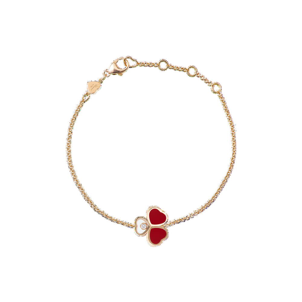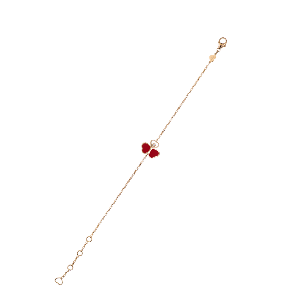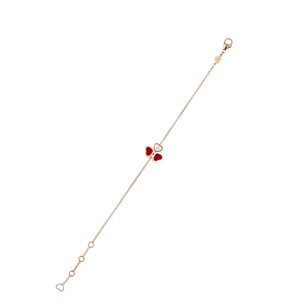 Als Inbegriff der Leichtigkeit hauchte der Schmetterling den Diamant-Armbändern Happy Hearts Wings all seine Zartheit und symbolische Kraft ein. In den Linien dieser Luxus-Schmuckkollektion wird er mit einer außergewöhnlichen Raffinesse interpretiert, welche die Symbolik des Hauses Chopard widerspiegelt. Zwei wie die Flügel eines Schmetterlings angeordnete Herzen aus rotem Stein und Roségold bilden ein Arrangement mit einem Herz, in dem sich ein beweglicher Diamant befindet. Little Diamonds Do Great Things.