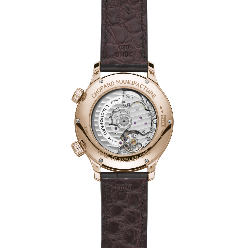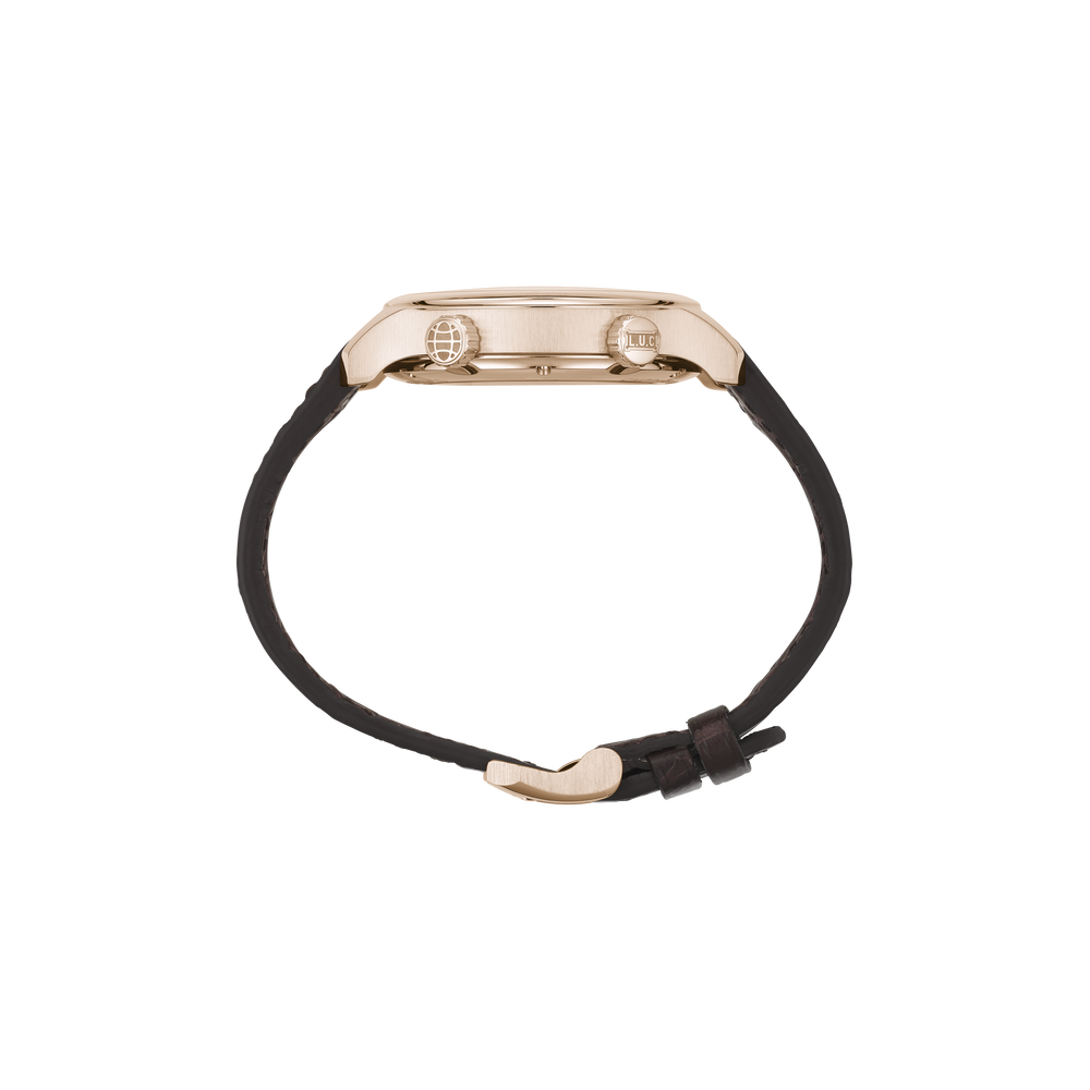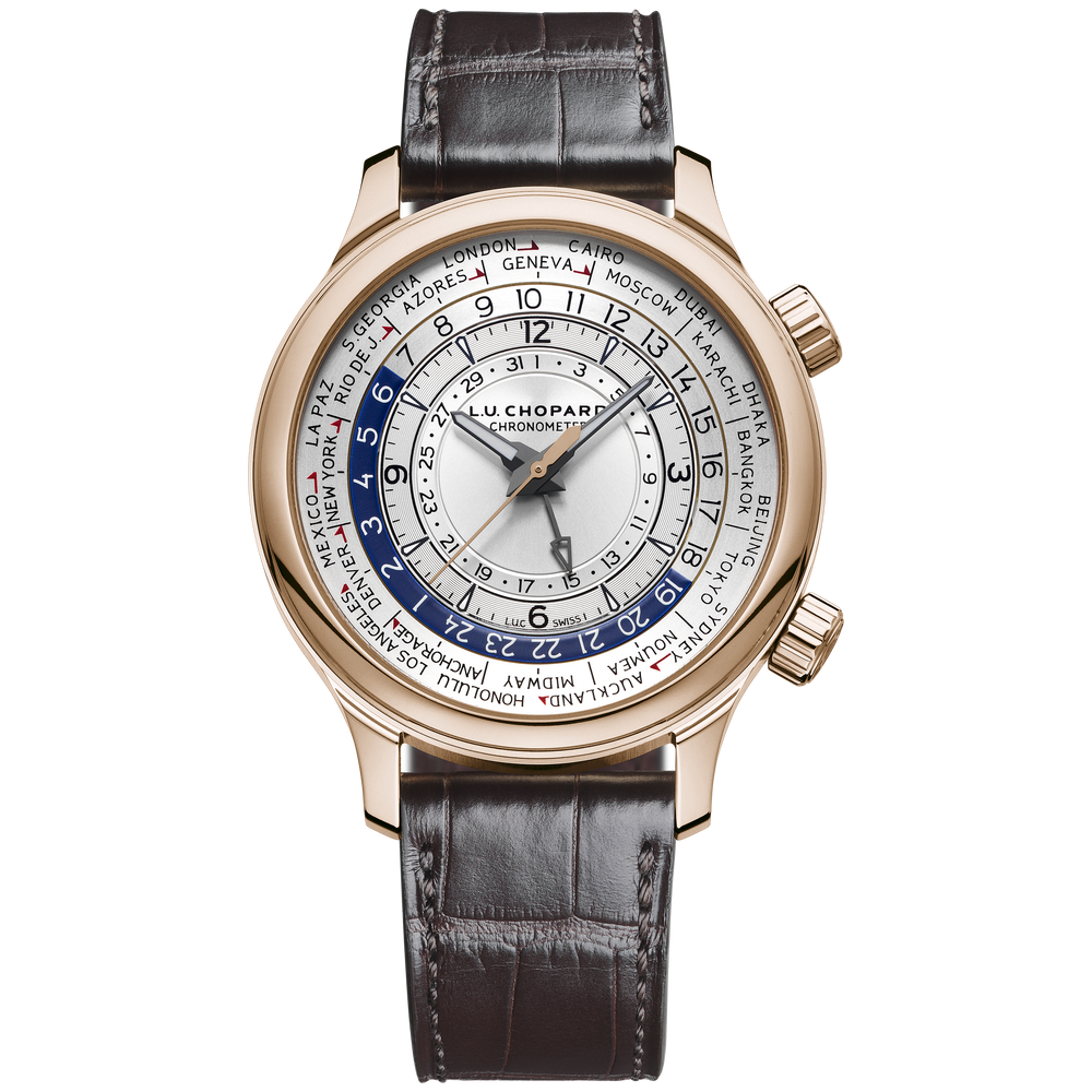 Dank vollendeter Eleganz, einwandfreier Qualität und hochmoderner Technologie sind die L.U.C. Armbanduhren die perfekten Zeitmesser für den modernen Gentleman, der die edlen Dinge im Leben schätzt. Die L.U.C Time Traveler One aus 18 Karat Roségold eignet sich ideal für internationale Reisende und verfügt über eine Komplikation, die alle Zeitzonen gleichzeitig anzeigt.