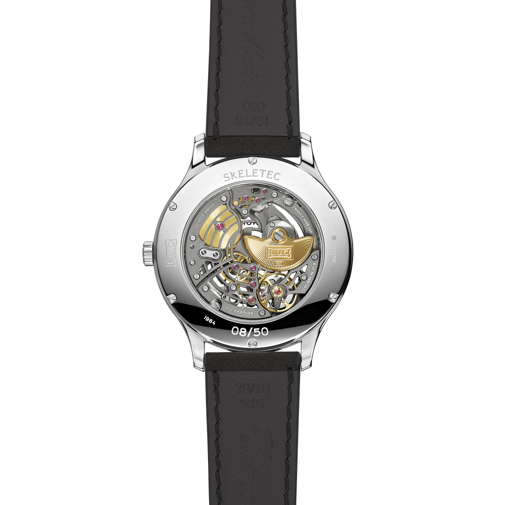 Die L.U.C XP Skeletec gehört zu den weltweit flachsten und am schönsten verarbeiteten skelettierten Uhren mit Handaufzug. Zum 25. Jubiläum der Chopard Manufacture präsentiert sie sich in neuer Eleganz. Neben ihrer geringen Höhe von nur 7,2 mm wird sie seit ihrer Präsentation im Jahr 2012 auch aufgrund ihrer Verbindung von technischer Exzellenz und handwerklicher Perfektion bewundert. Durch die Überarbeitung des Designs verleiht Chopard Manufacture diesem Meisterwerk eine frische Eleganz mit einem noch offeneren Zifferblatt zur Präsentation des Uhrwerks L.U.C 96.17-S, einer verfeinerten Ästhetik und einem Gehäuse aus ethischem 18 Karat Weißgold. Die L.U.C XP Skeletec wurde vollständig im Haus gefertigt, speziell die Skelettierung wurde von Hand in den Ateliers des Hauses in Fleurier ausgeführt. Sie gehört zu den diskretesten Repräsentanten der hohen Uhrmacherkunst von Chopard.