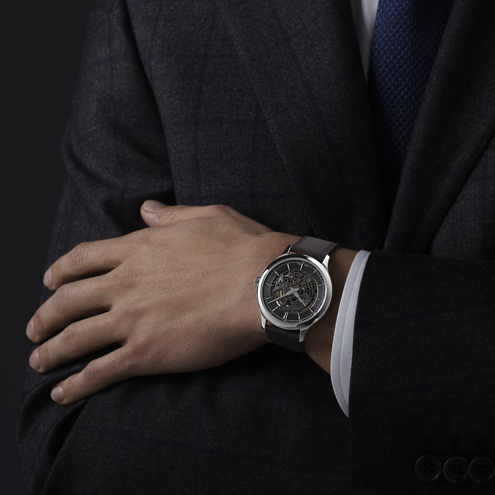 Zifferblatt: Skelettiert und durch Galvanisierung erreichter, schiefergrauer Farbton – mit Rhodium beschichtete Indexe in Keilform