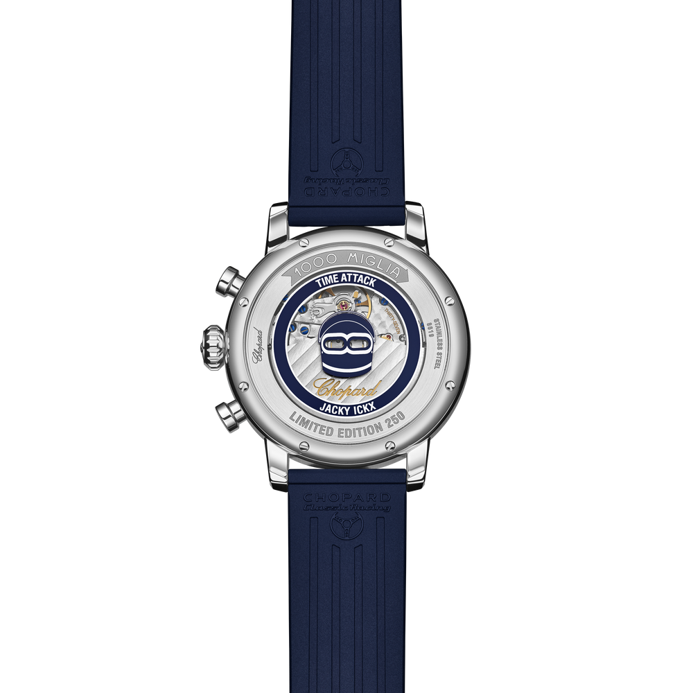 Der Mille Miglia Classic Chronograph ist mit größter Präzision und hohem Anspruch gefertigt. Er ist eine Hommage an die enge Verbindung zwischen Chopard und dem erfolgreichen Rennfahrer Jacky Ickx, der seit vielen Jahren Botschafter des Hauses ist. Jacky Ickx teilt seit mehr als 35 Jahren die Begeisterung und Leidenschaft von Chopard für das Rennen 1000 Miglia. Dessen Werte wie Zusammenarbeit und Hingabe haben auch die Jahre dieser Partnerschaft geprägt und kommen in den Uhren zum Ausdruck – von der sorgfältigen Gestaltung bis hin zur exquisiten Handwerkskunst. Mit einer weltweiten Limitierung der Edition auf 250 Stück bietet diese Kollektion die Gelegenheit, ein echtes Stück Geschichte zu besitzen.