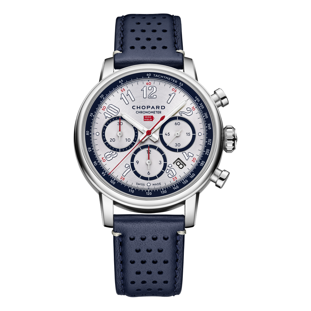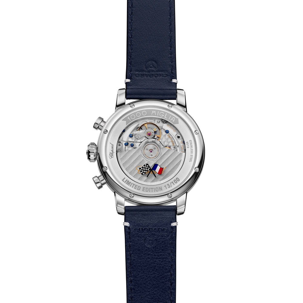 Seit 35 Jahren sind Chopard und die 1000 Miglia untrennbar miteinander verbunden. Als offizieller Zeitnehmer des bekanntesten Gleichmäßigkeitsrennens der Welt für historische Automobile hat Chopard den Mille Miglia Chronographen entworfen. Das Modell steht für die Liebe zur ästhetischen Technik und Leistung und geht auf die persönliche Begeisterung von Karl-Friedrich Scheufele für Autos und Autorennen zurück. Die Uhren der auf 100 Stück limitierten Edition haben ihren Auftritt in den unverkennbaren französischen Nationalfarben und sind ein Beispiel für die perfekte Verbindung von Stil und Raffinesse.
