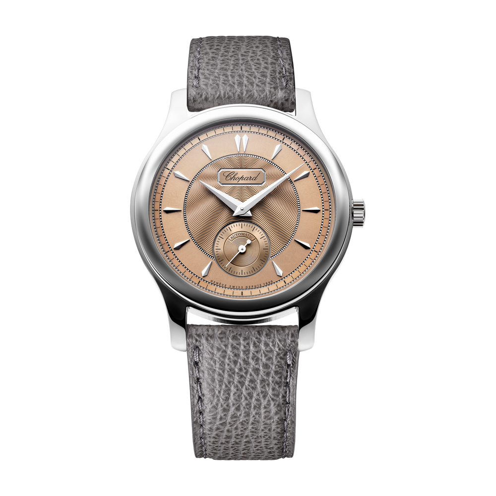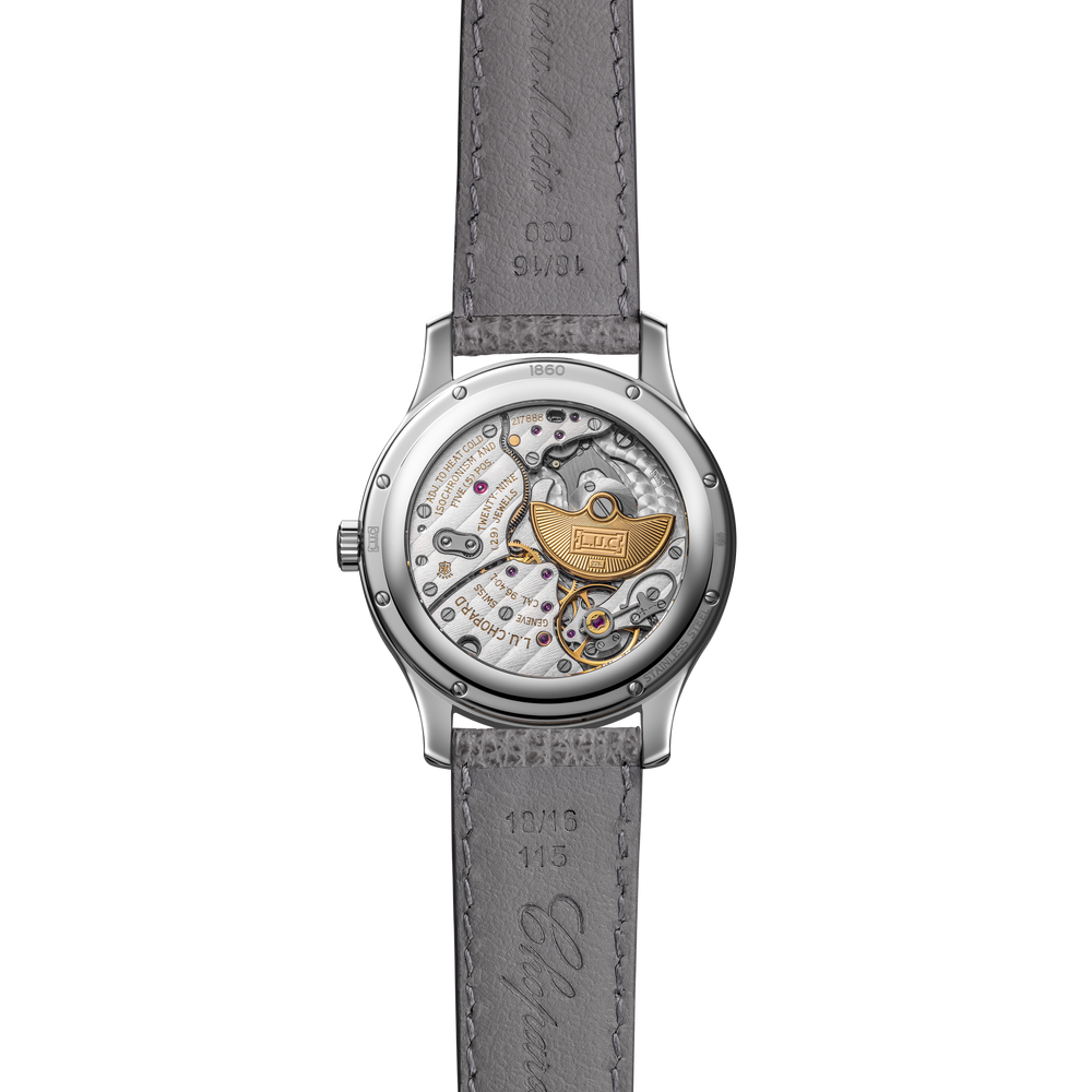Die Schweizer Uhr L.U.C 1860 wird in Lucent Steel™ gefertigt, behält aber ihre ursprünglichen Proportionen und ihr Design bei. Blickfang sind das lachsfarbene, von Hand guillochierte Zifferblatt sowie das Vintage-Kalbslederband. Dank der uhrmacherischen Kompetenz der Chopard Manufacture ist die Luxusuhr mit dem Kaliber L.U.C 96.40-L ausgestattet, das als Chronometer zertifiziert und mit dem Genfer Siegel Poinçon de Genève ausgezeichnet ist. Das lediglich 3,3 mm hohe Uhrwerk verfügt über einen beidseitig aufziehenden Mikrorotor in Gold sowie zwei Federhäuser, die eine Gangreserve von 65 Stunden garantieren. Die Luxusuhr L.U.C 1860 verbindet meisterliches Uhrmacherhandwerk mit einem zeitlosen Design und empfiehlt sich selbst für den anspruchsvollsten Sammler.