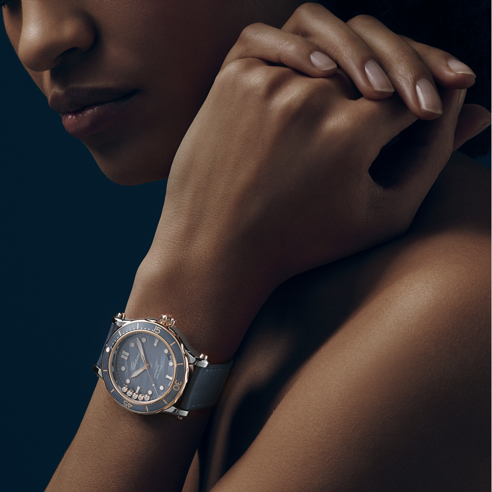 Die ebenso sportliche wie elegante Happy Ocean ist die ideale Uhr, um den Meeresgrund zu entdecken, sich auf einem Segelboot genüsslich dem süßen Nichtstun hinzugeben oder im Sand zu tanzen. Dieses Modell bietet Technik und Spaß, ist wasserdicht und schlägt zum Takt eines Automatikwerks von Chopard. Little Diamonds Do Great Things
