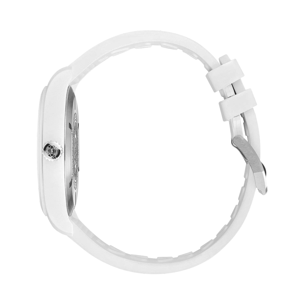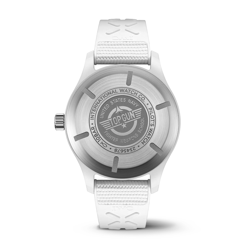 Die Pilot’s Watch Automatic 41 TOP GUN Lake Tahoe präsentiert sich mit einem markanten Gehäuse aus weißer Keramik, einem schwarzen Zifferblatt mit weißen Ziffern und Indizes sowie einem weißen Kautschukarmband.