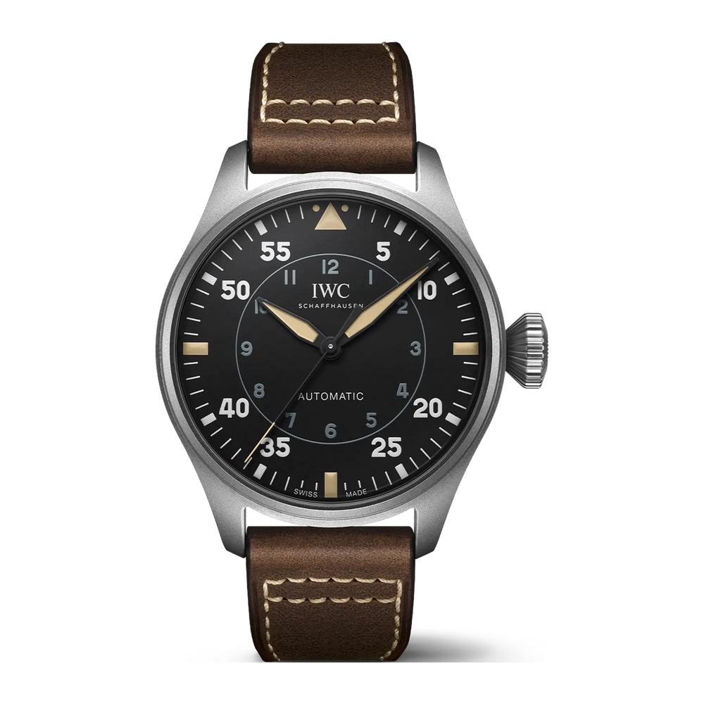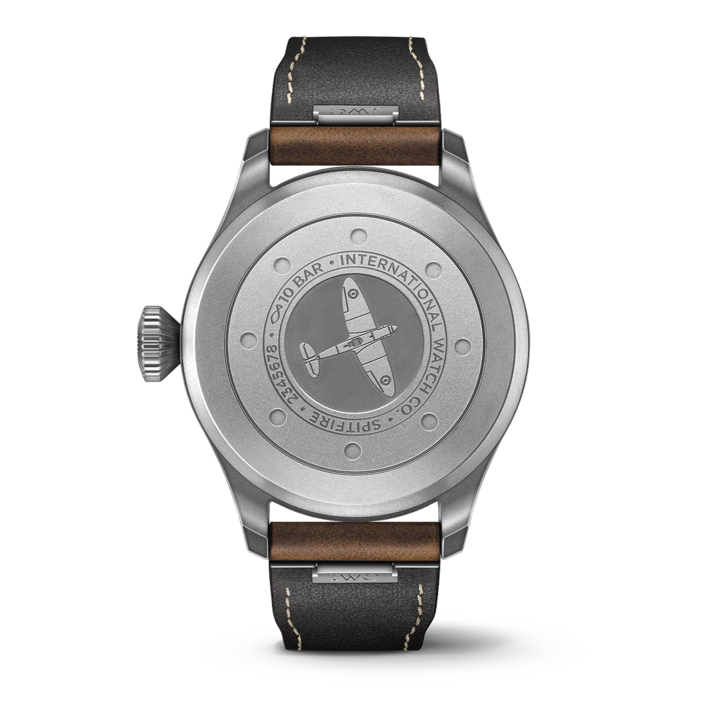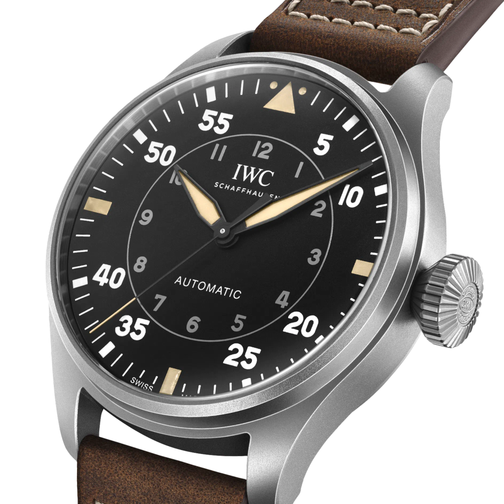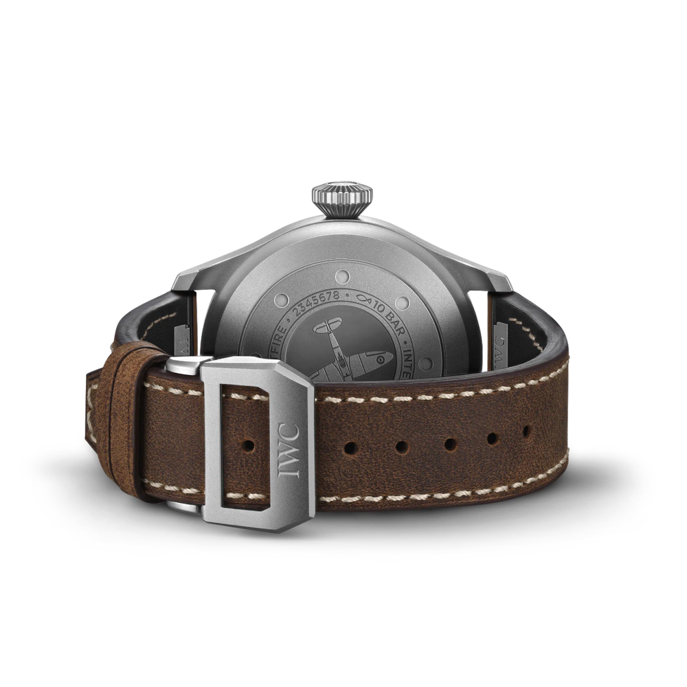 Die Big Pilot's Watch 43 Spitfire besticht durch ihre militärische Ästhetik mit einem mattgrauen Gehäuse und einer Krone aus Titan sowie einem schwarzen Zifferblatt im Stil von historischen Beobachtungsuhren.