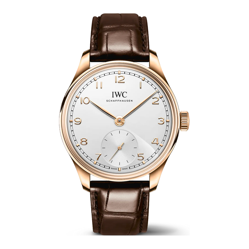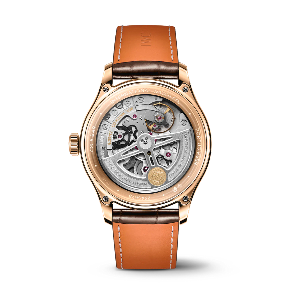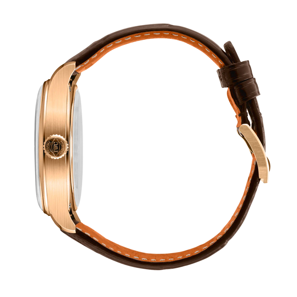 Diese Version verfügt über ein Gehäuse aus 18-karätigem Rotgold mit einem Durchmesser von 40,4 mm, ein versilbertes Zifferblatt sowie vergoldete Zeiger und Goldappliken.