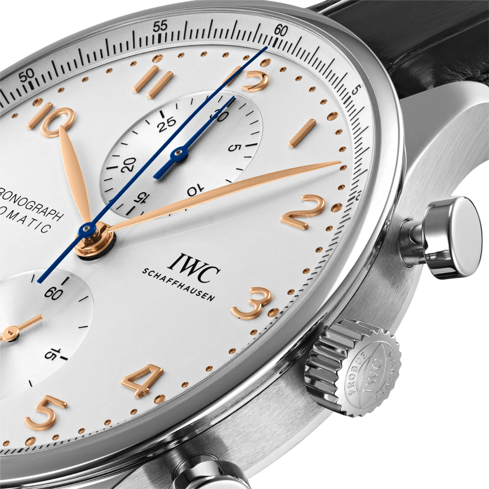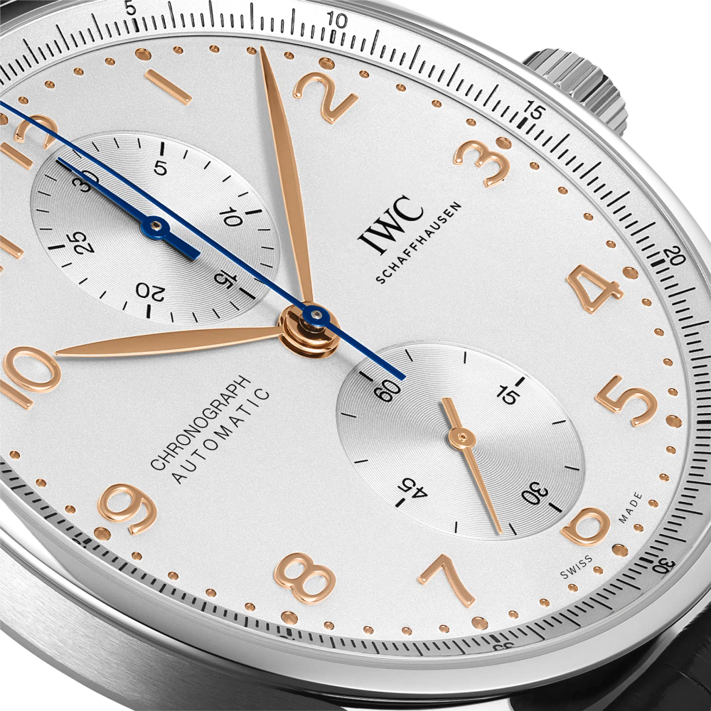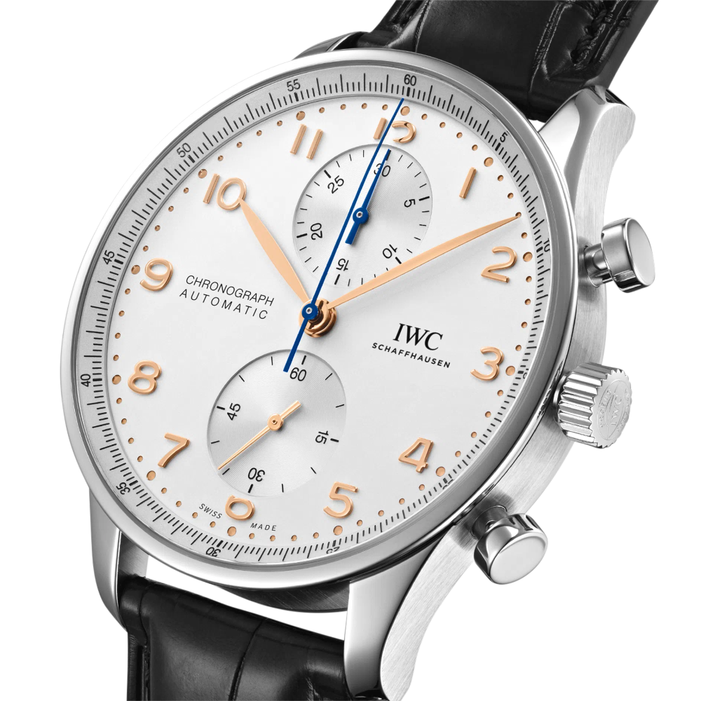 Der harmonisch gestaltete Chronograph mit umlaufender Präzisionsskala und vertieften Totalisatoren ist seit 1998 das begehrteste Mitglied der Portugieser-Familie