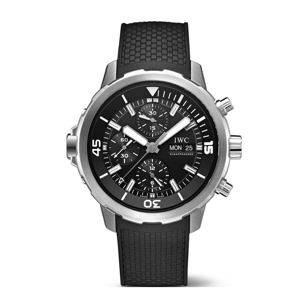 Stoppzeiten bis zu 12 Stunden, Datums- und Wochentagsanzeige und sportlich-elegantes Design: Mit diesem Chronographen haben Sie nicht nur die Tauchzeit stets im Griff.