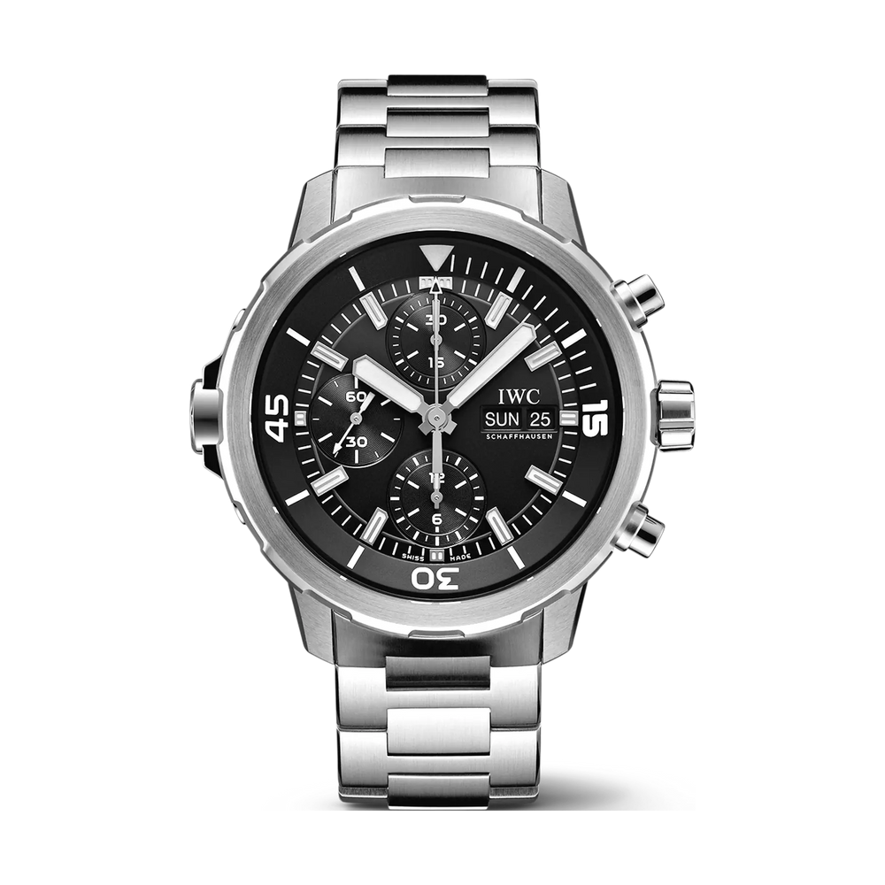 Stoppzeiten bis zu 12 Stunden, Datums- und Wochentagsanzeige und sportlich-elegantes Design: Mit diesem Chronographen haben Sie nicht nur die Tauchzeit stets im Griff.