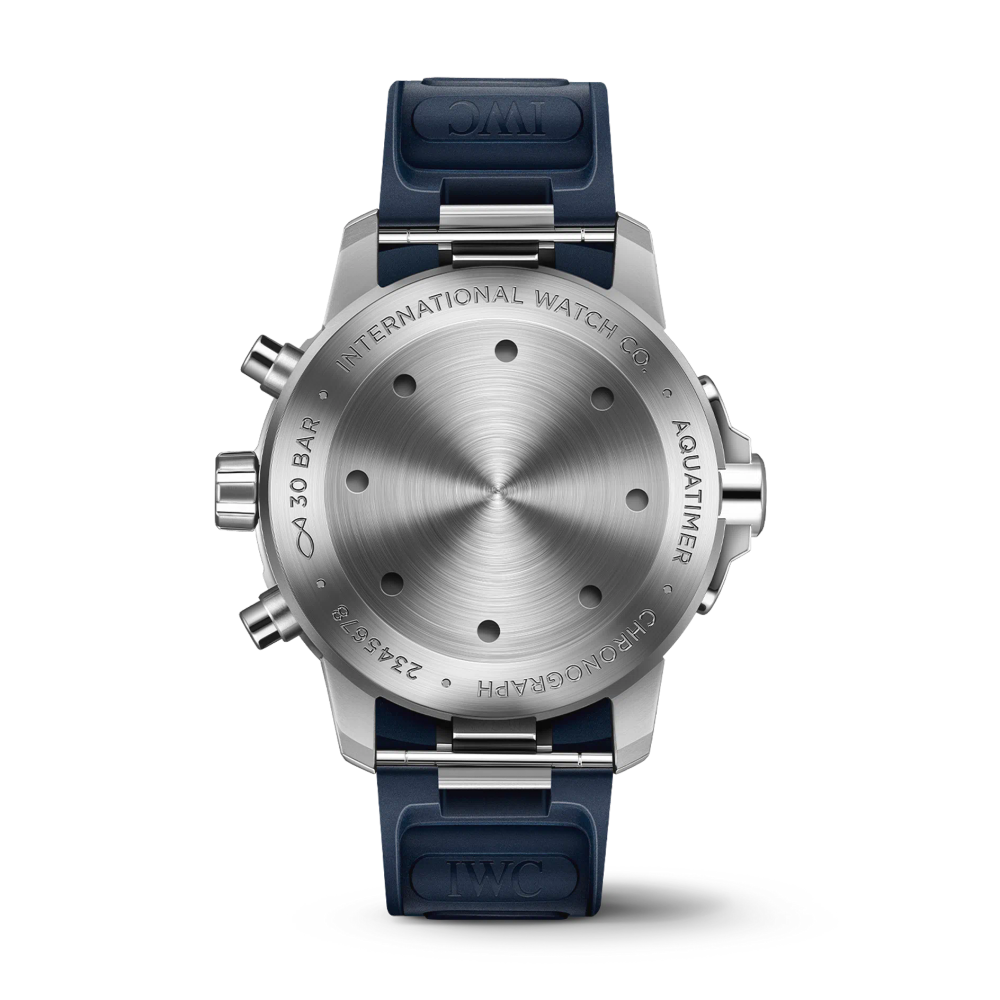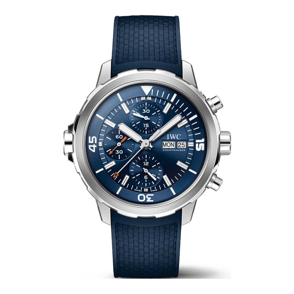 Dieser Aquatimer Chronograph ist bis 30 bar wasserdicht und verfügt über ein Edelstahlgehäuse, ein blaues Zifferblatt und ein blaues Kautschukarmband.