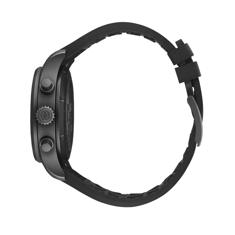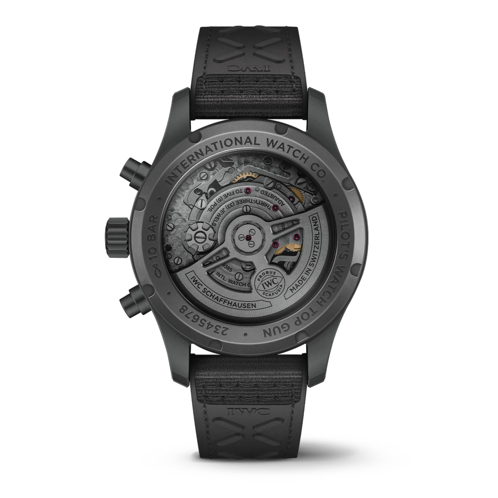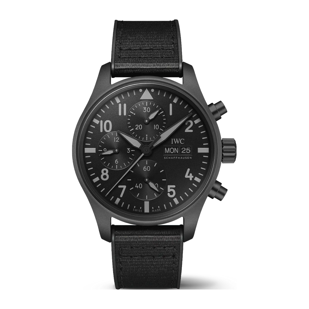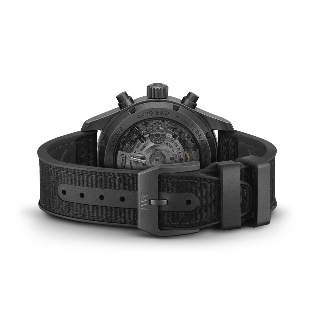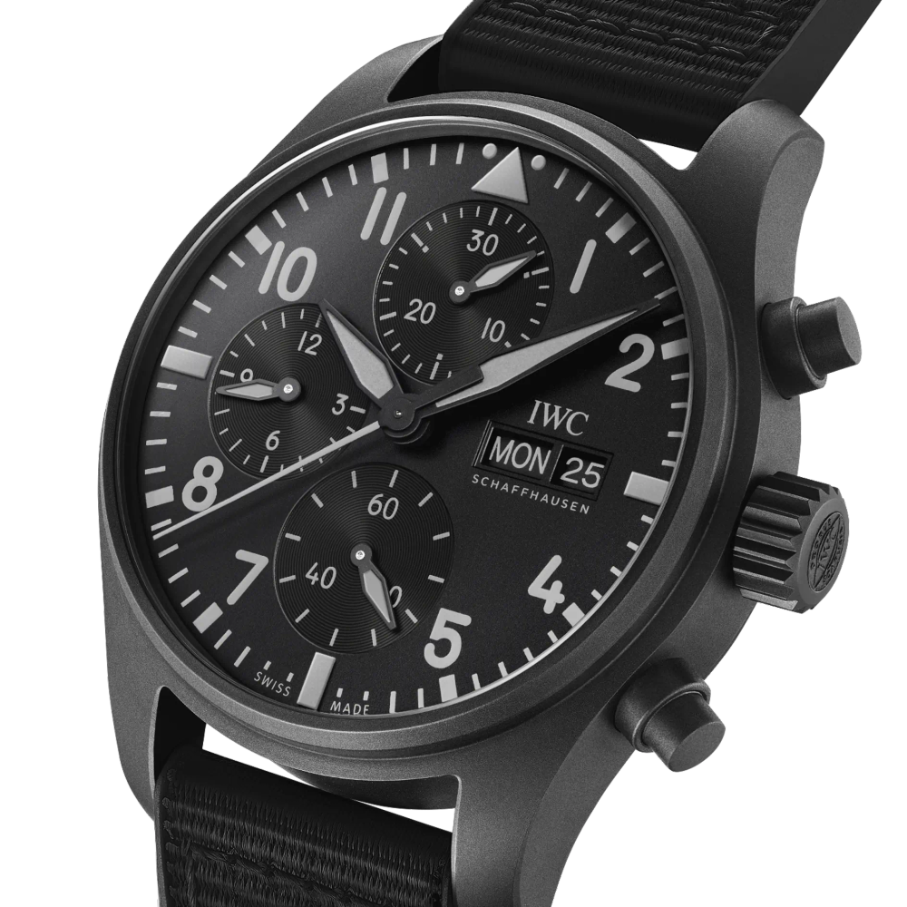Gehäuse, Krone und Drücker aus dem von IWC entwickelten Material Ceratanium® verleihen der Pilot’s Watch Chronograph 41 TOP GUN Ceratanium® ein komplett schwarzes Design.