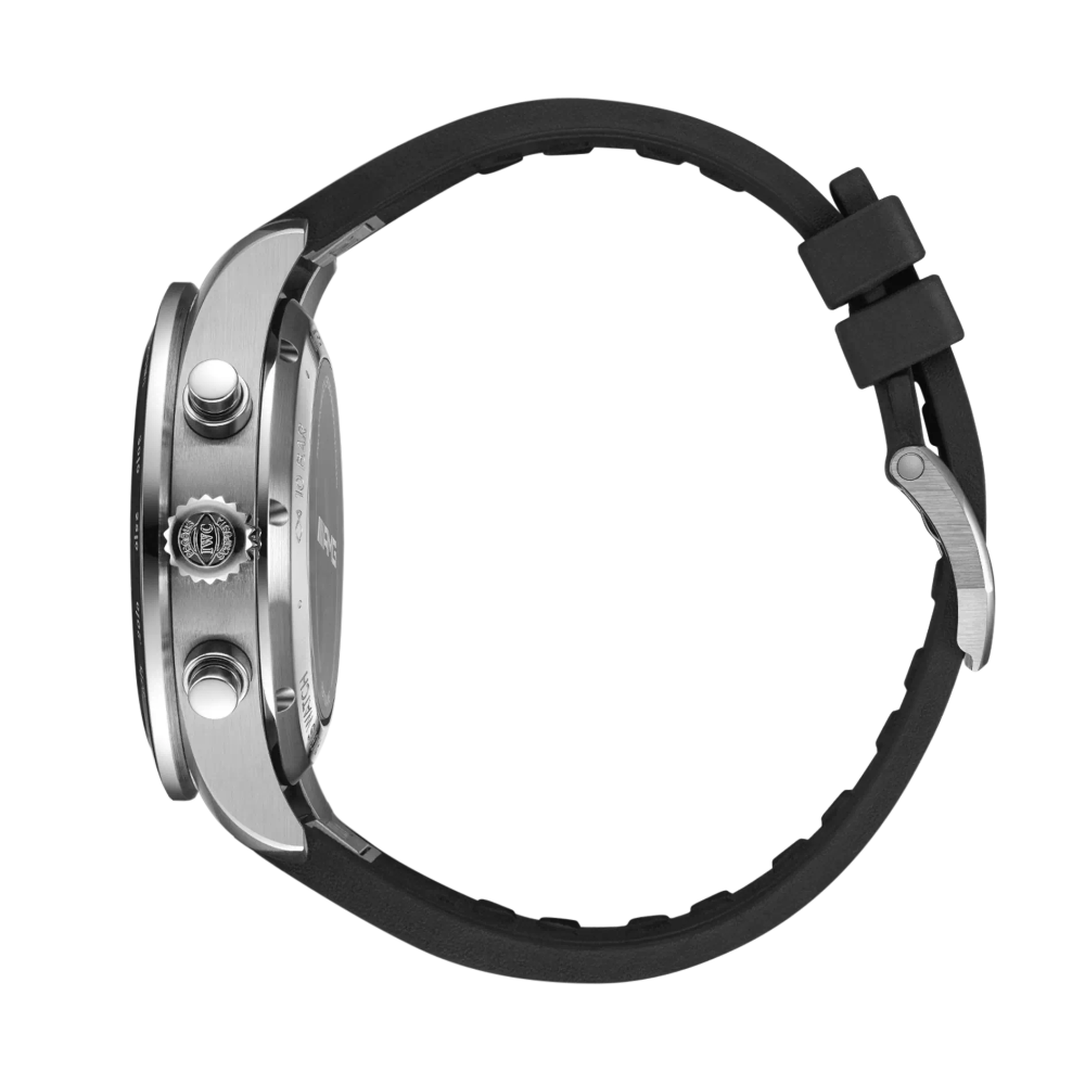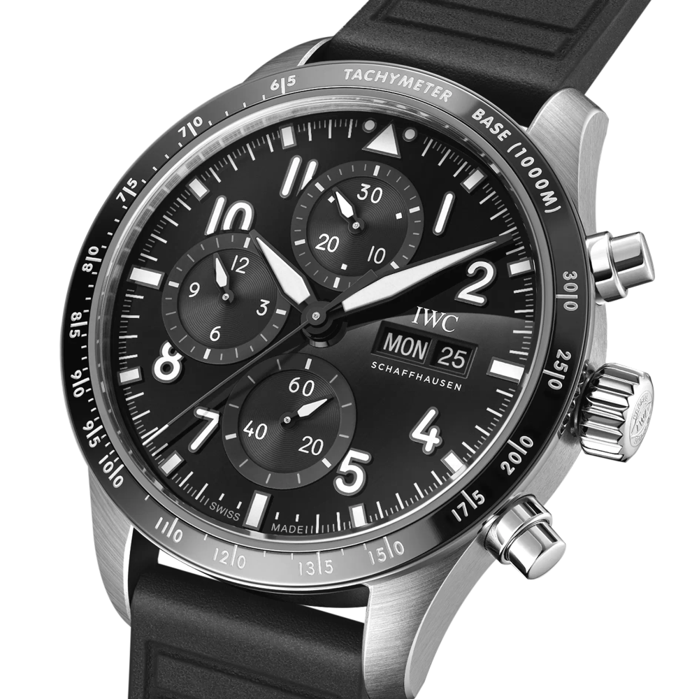 Die Pilot’s Watch Performance Chronograph 41 AMG verfügt über ein 41-Millimeter-Gehäuse aus Titan, ein schwarzes Zifferblatt, Zeiger und Appliken aus geschwärztem Nickel sowie ein schwarzes Kautschukarmband.