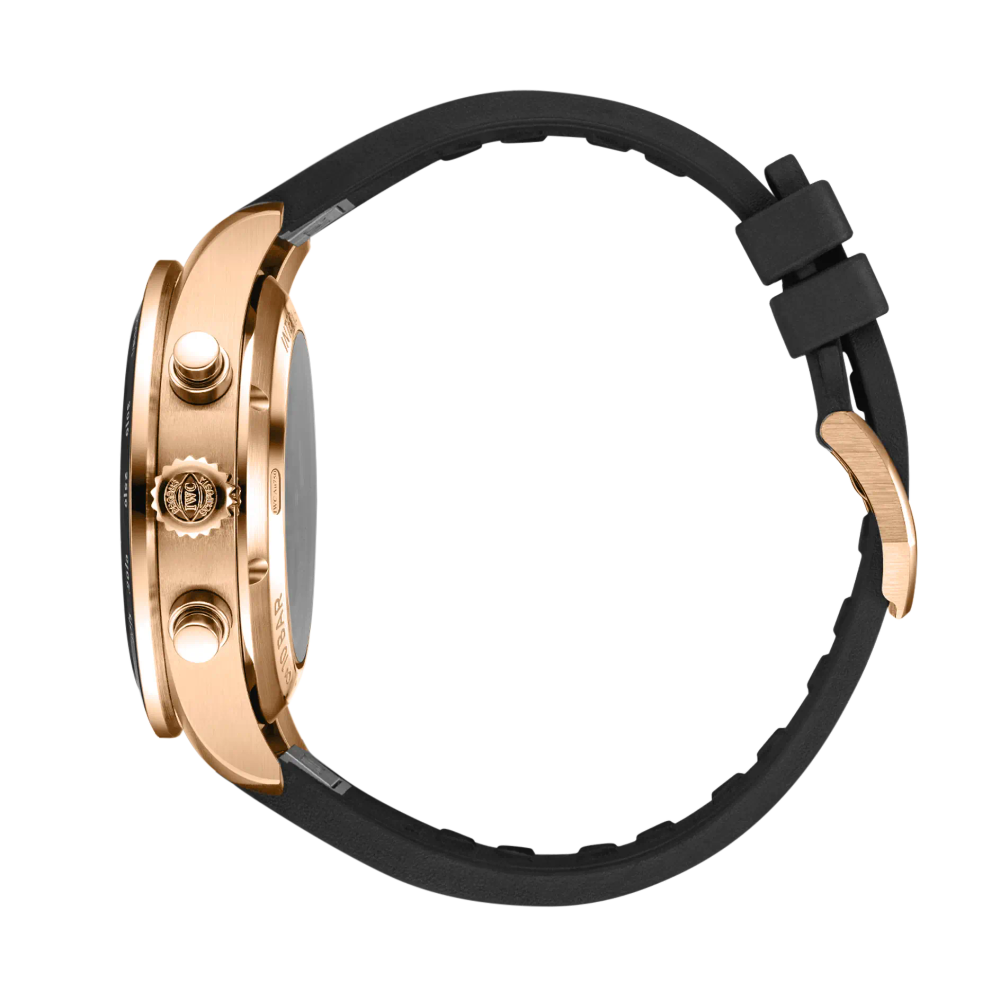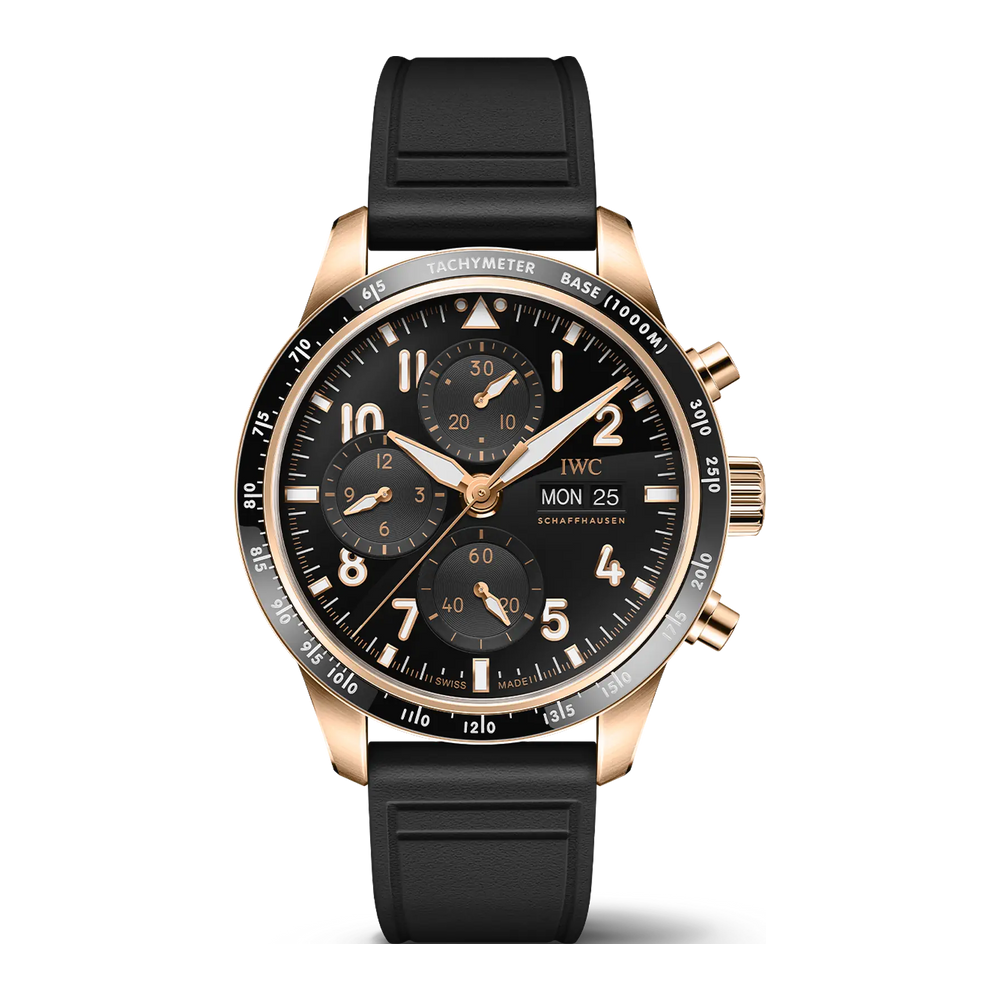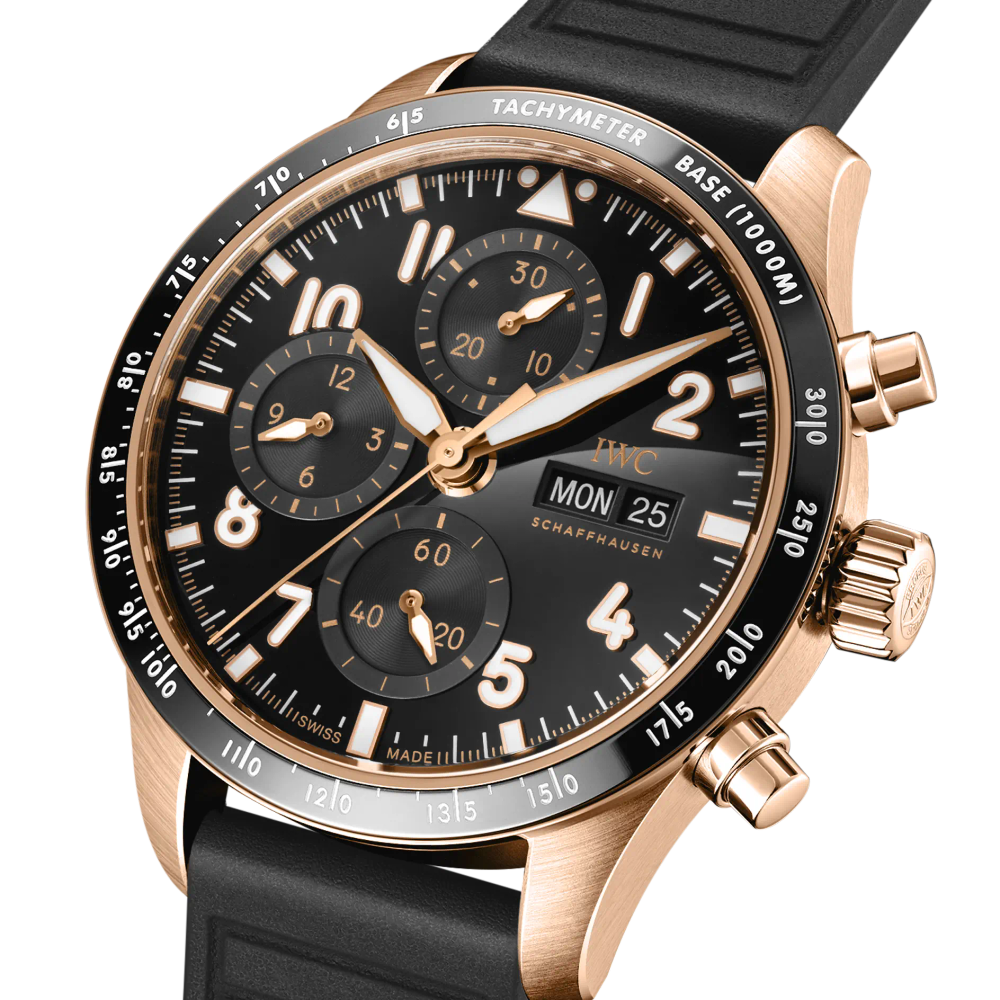 Die Pilot’s Watch Performance Chronograph 41 verfügt über ein Gehäuse aus 18-Karat Rotgold, ein schwarzes Zifferblatt mit Lack-Finish sowie vergoldete Zeiger und Appliken.