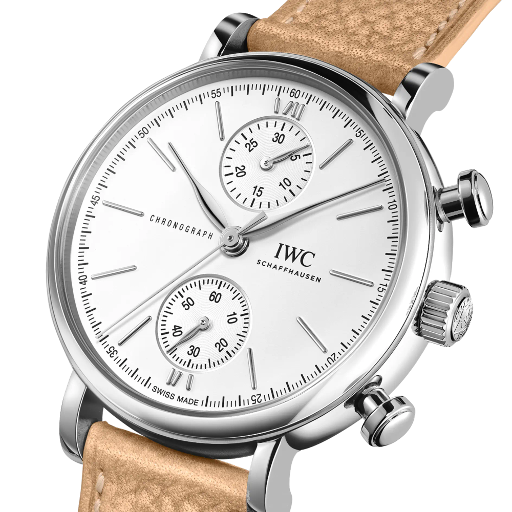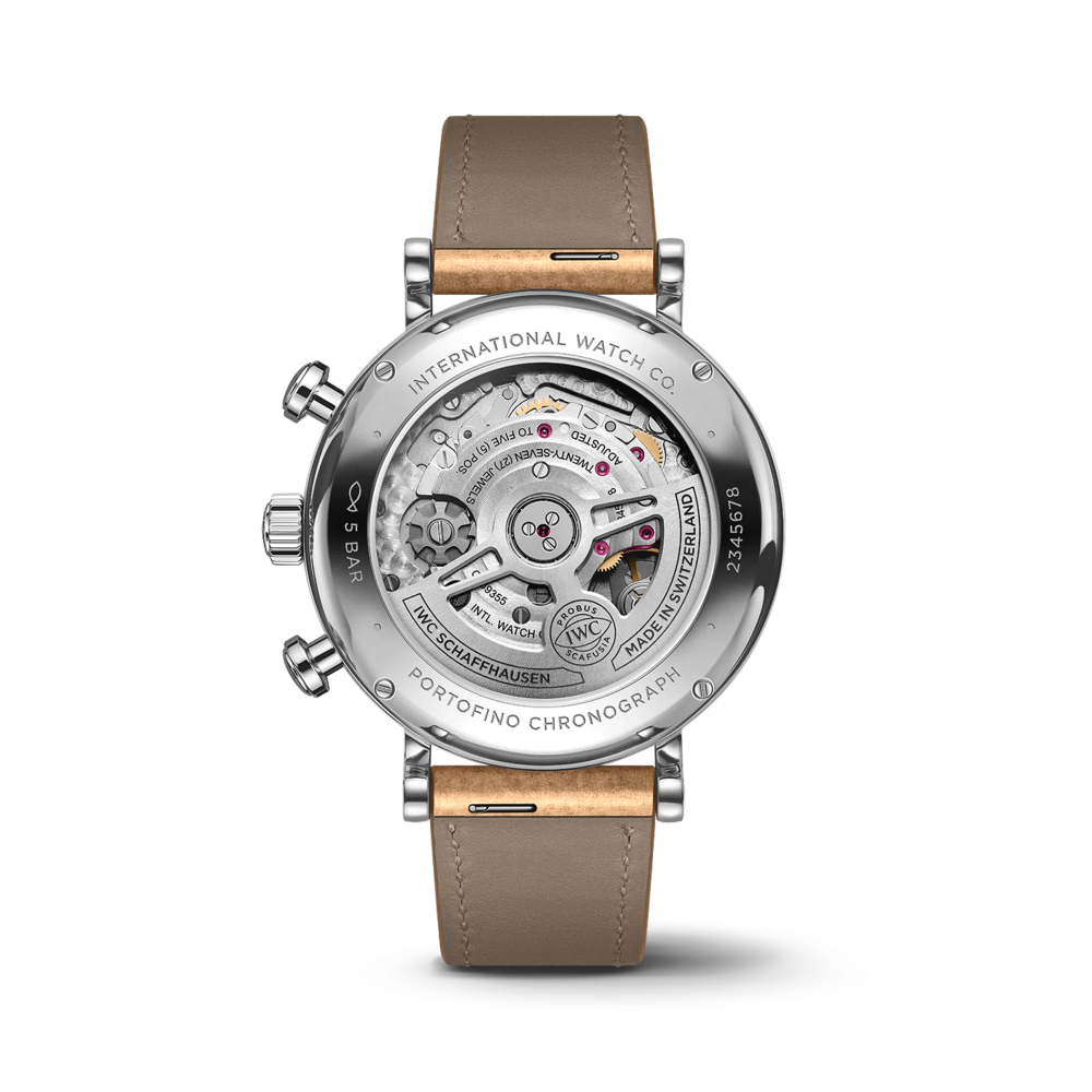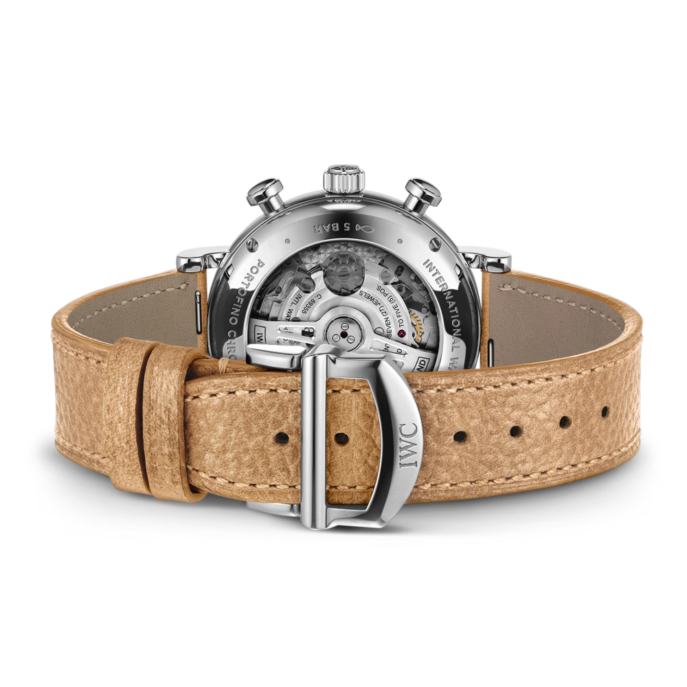 Die Portofino Chronograph 39 ist mit dem IWC-Manufakturkaliber 69355 und einem Sichtboden aus Saphirglas ausgestattet.