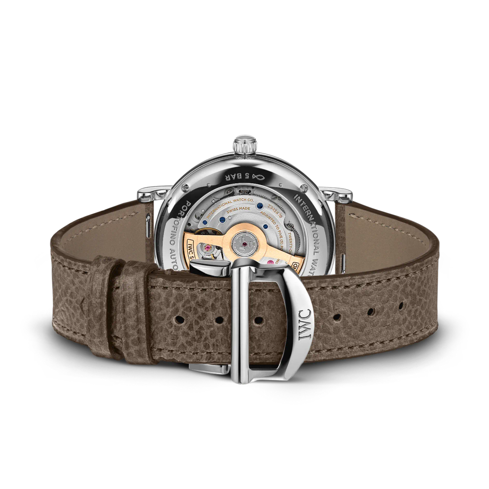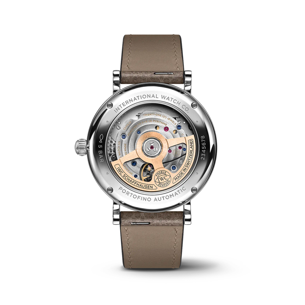 Die Portofino Automatic 37 ist mit dem IWC-Manufakturkaliber 32111 ausgestattet und verfügt über einen Sichtboden aus Saphirglas.