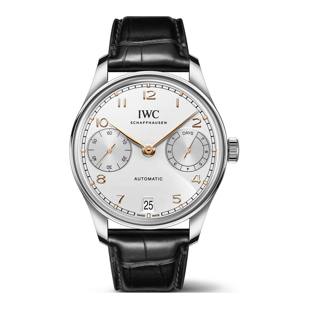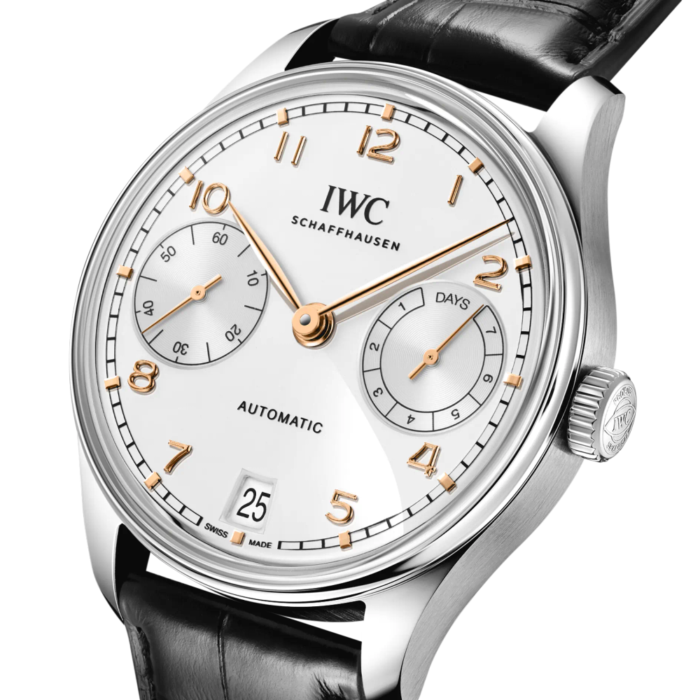 Die Ursprünge der Portugieser reichen in die späten 1930er Jahre zurück, als IWC Schaffhausen ein hochpräzises Taschenuhrwerk verwendete, um eine besonders grosse Armbanduhr mit Chronometer-Präzision zu schaffen. Die im Jahr 2000 eingeführte Portugieser Automatic 42 präsentiert ein offenes, ausgewogenes Zifferblatt mit einer Gangreserveanzeige um 3 Uhr und einer auf der gegenüberliegenden Seite um 9 Uhr positionierten Sekundenanzeige.