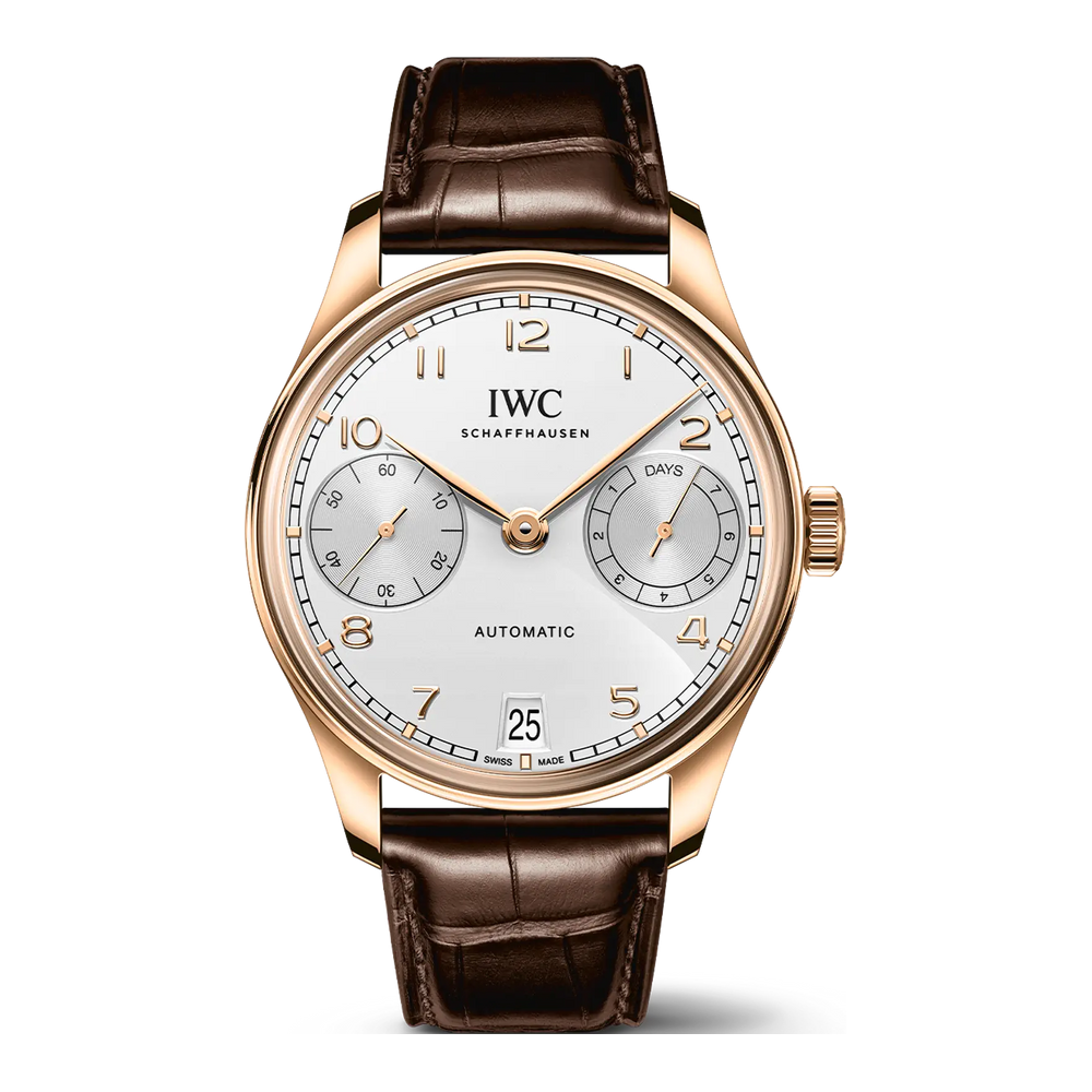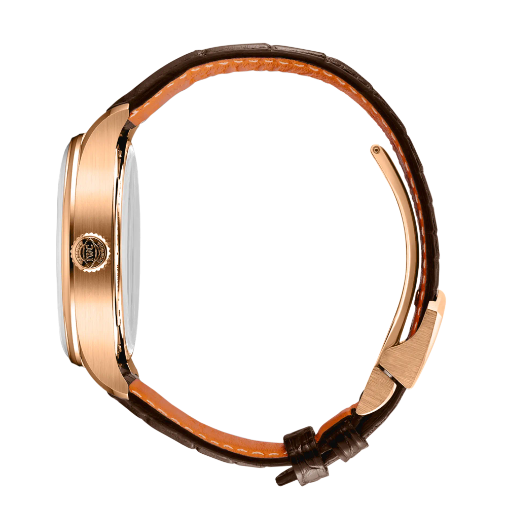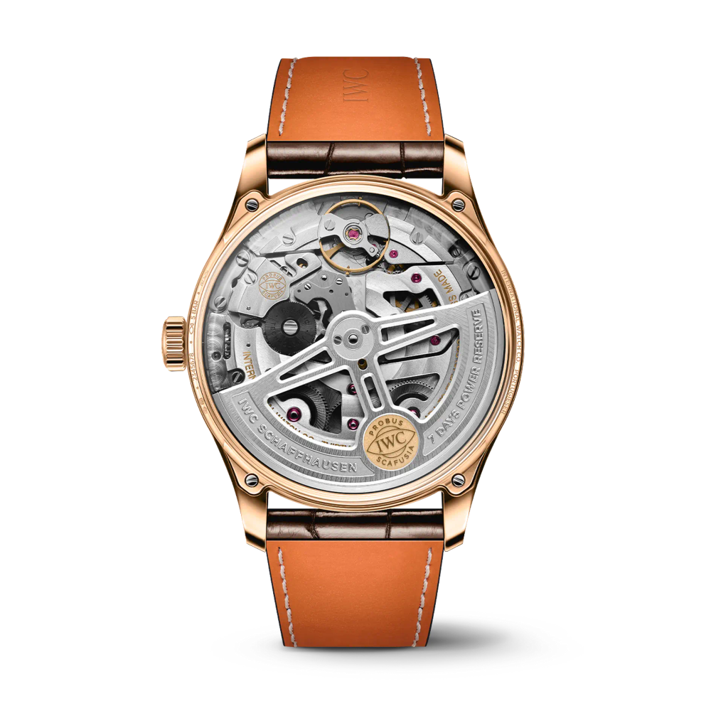 Diese Version verfügt über ein poliertes Gehäuse aus 18-karätigem Rotgold mit einem Durchmesser von 42,4 mm, ein versilbertes Zifferblatt sowie vergoldete Zeiger und Goldappliken.