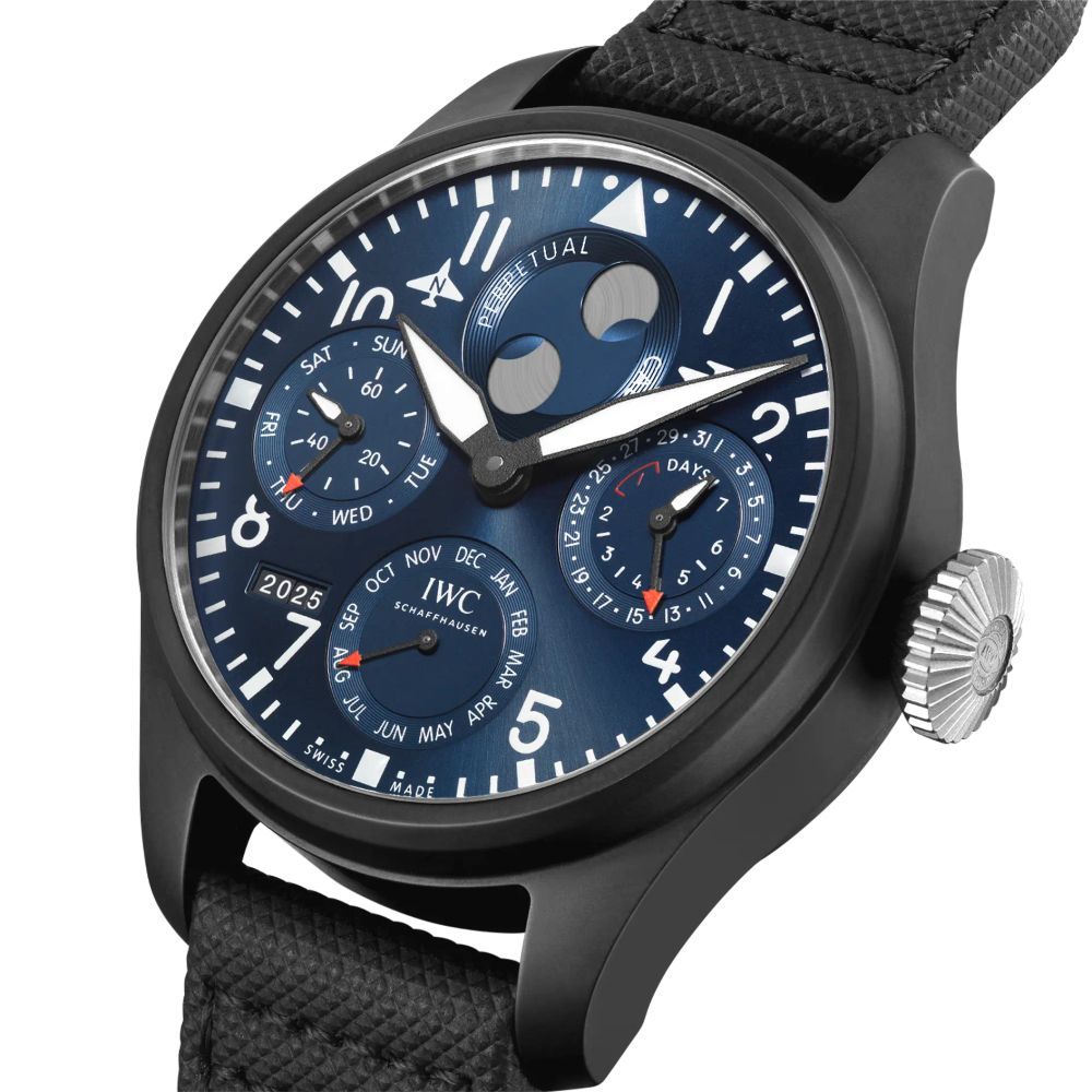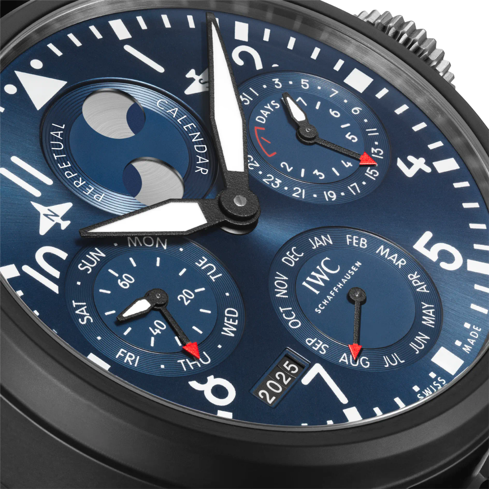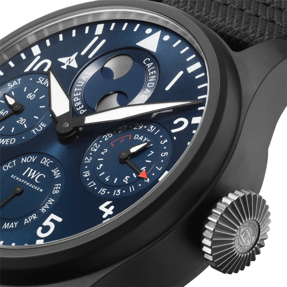 Diese Sonderedition einer grossen Fliegeruhr verfügt über einen ewigen Kalender, ein schwarzes Keramikgehäuse und ein blaues Zifferblatt.