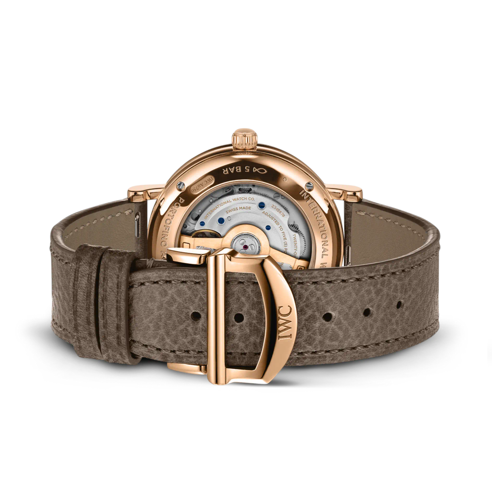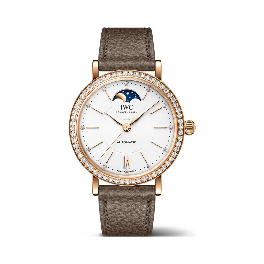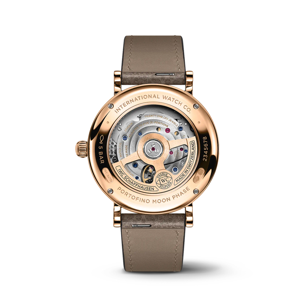 Die Portofino Automatic Moon Phase 37 ist mit dem IWC-Manufakturkaliber 32800 ausgestattet und verfügt über einen Sichtboden aus Saphirglas.