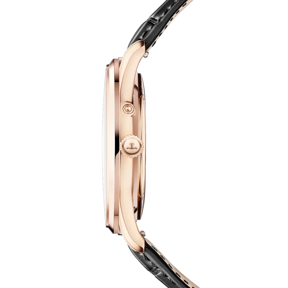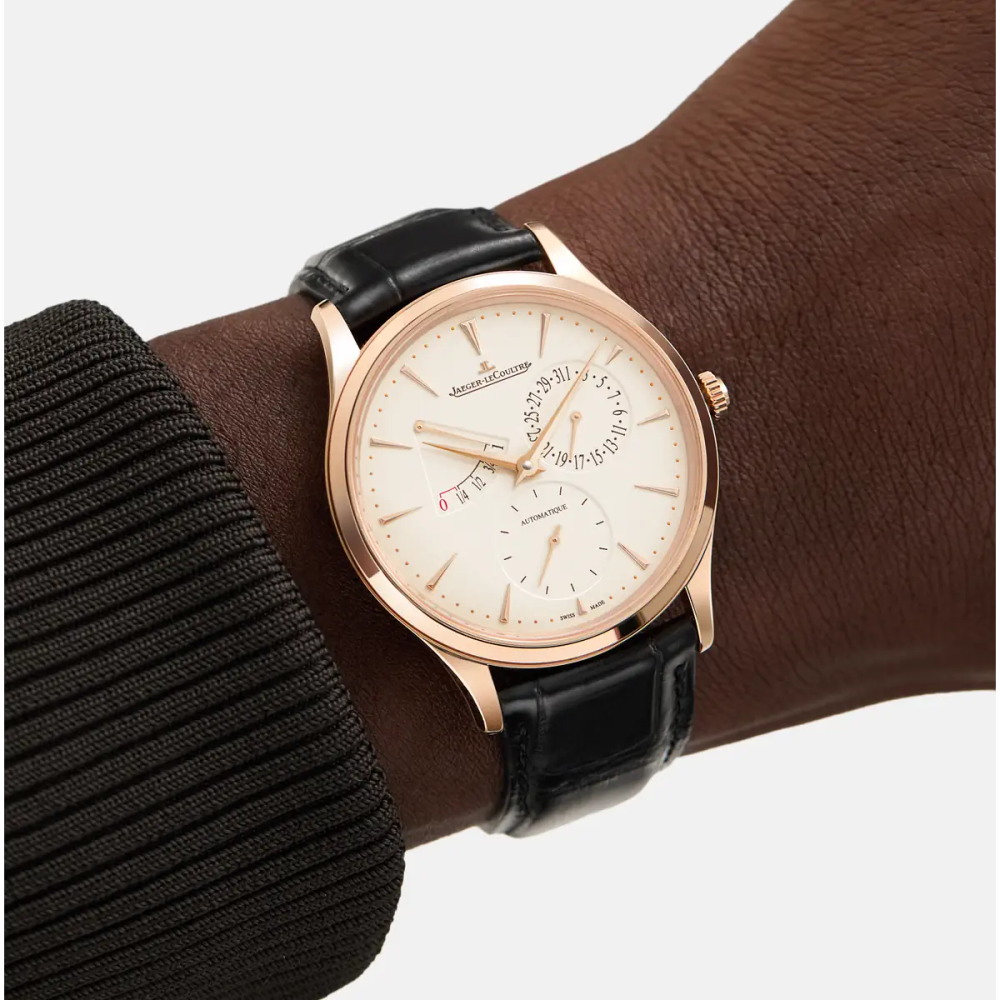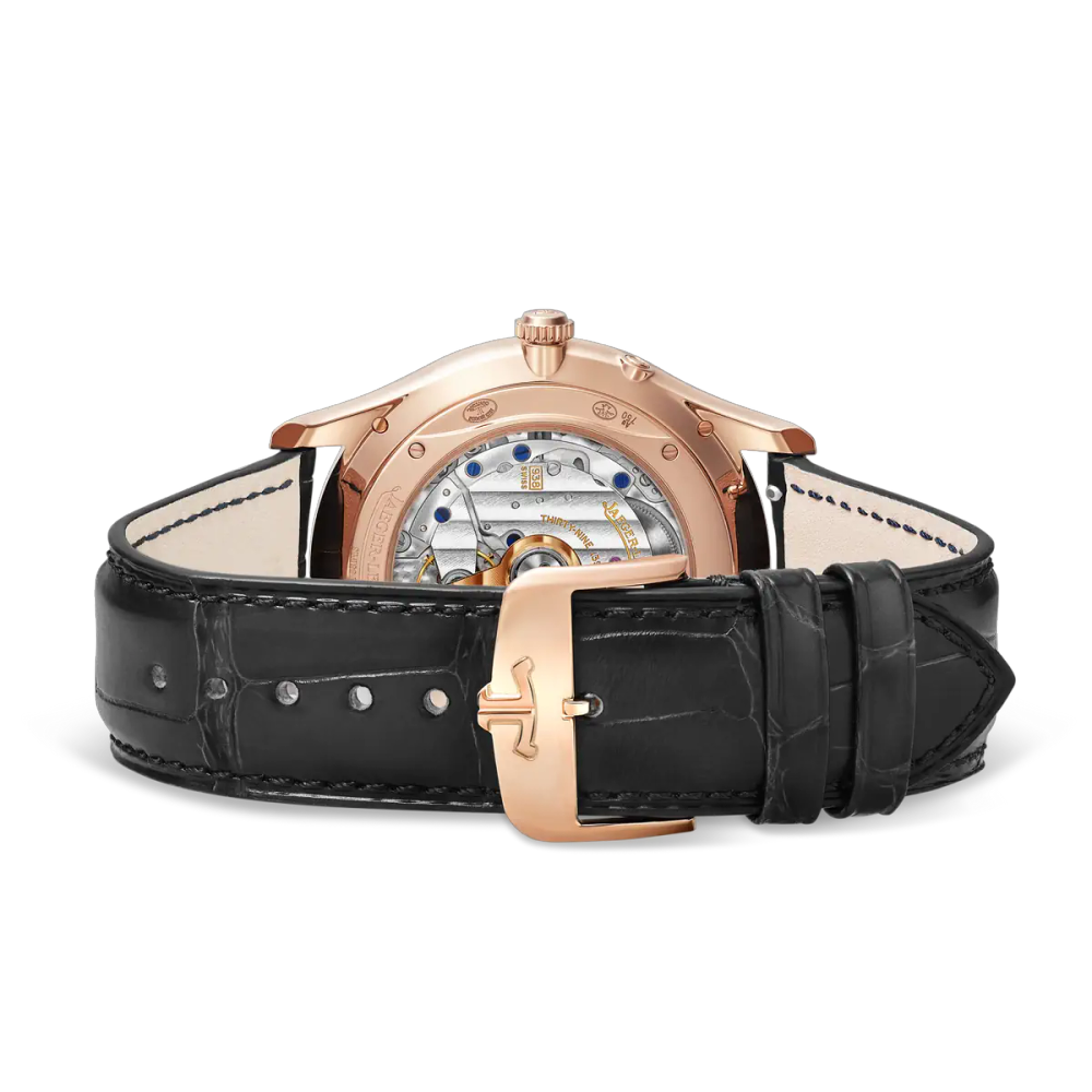 Die Master Ultra Thin Power Reserve in Rotgold interpretiert die Merkmale der Kollektion neu und zeichnet sich durch ein elegantes Design aus, das Tradition und Moderne vereint. Auf ihrem eierschalenfarbenen Zifferblatt, welches das Rotgold-Gehäuse perfekt ergänzt, heben die zweifach polierten und satinierten Zeiger drei Zähler hervor. Diese zeigen die Gangreserve (links), die Datumsanzeige (rechts) sowie die kleinen Sekunden bei 6 Uhr an. Diese äußerst raffinierten Details offenbaren ein Gehäuse mit sehr ausgewogenen Proportionen, das in die geschwungenen Bandanstöße übergeht. Das sorgt für ein besonders angenehmes Tragegefühl am Handgelenk. Bei Jaeger-LeCoultre schließen sich Raffinesse, mechanische Leistung und Präzision nicht gegenseitig aus. Die Master Ultra Thin Power Reserve ist mit dem Kaliber 938 der Manufaktur ausgestattet, das durch den Saphirglasboden des Gehäuses bewundert werden kann, und eine Gangreserve von 70 Stunden verspricht. Das Armband aus schwarzem Alligatorleder unterstreicht die unverwechselbare Eleganz dieses Zeitmessers.
