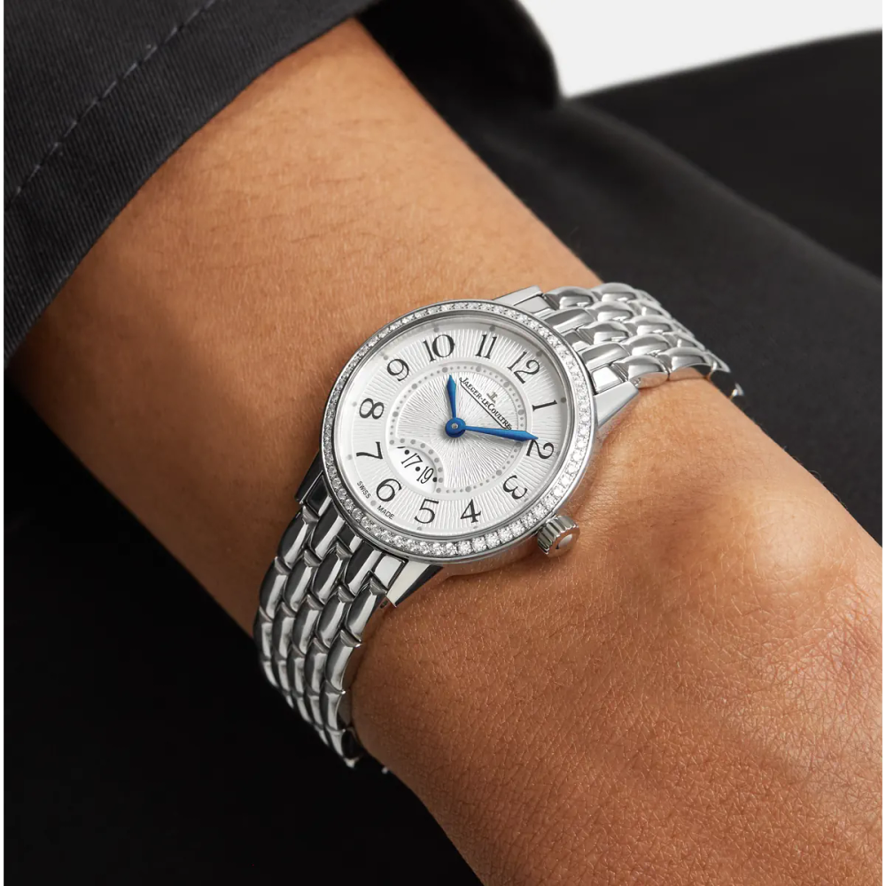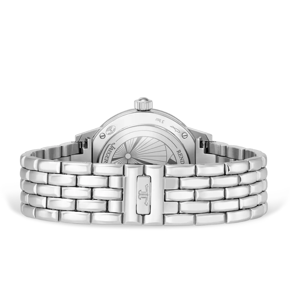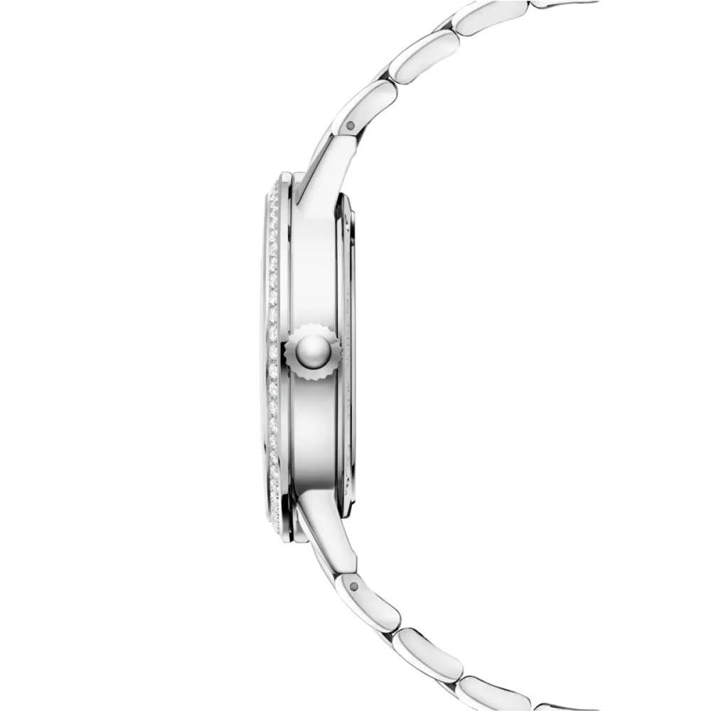 Das flexible Armband aus Edelstahl verleiht der Rendez-Vous Date einen modernen Look. Der Quarz-Zeitmesser bleibt den Designelementen dieser einzigartigen Kollektion treu und präsentiert seine Funktionen in einem eleganten und stilvollen Setting. Auf dem silbernen Zifferblatt mit Sonnenschliff-Guillochierung kommen die floralen Zeiger aus gebläutem Edelstahl und der Minutenring mit seinen versetzten Punkten, die die Stundenziffern unterstreichen, perfekt zur Geltung. Die Datumsanzeige in floraler Typografie – das Markenzeichen der Kollektion – kommt in einer Öffnung bei 6 Uhr zum Vorschein, während die geraden Zahlen dezent durch einen kleinen Punkt angezeigt werden. Die mit 60 Diamanten (0,42 Karat) besetzte Lünette verleiht dieser femininen Uhr den letzten Schliff an Raffinesse.
