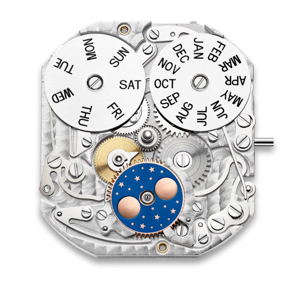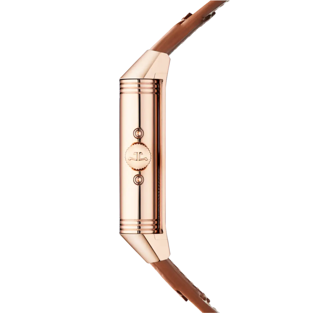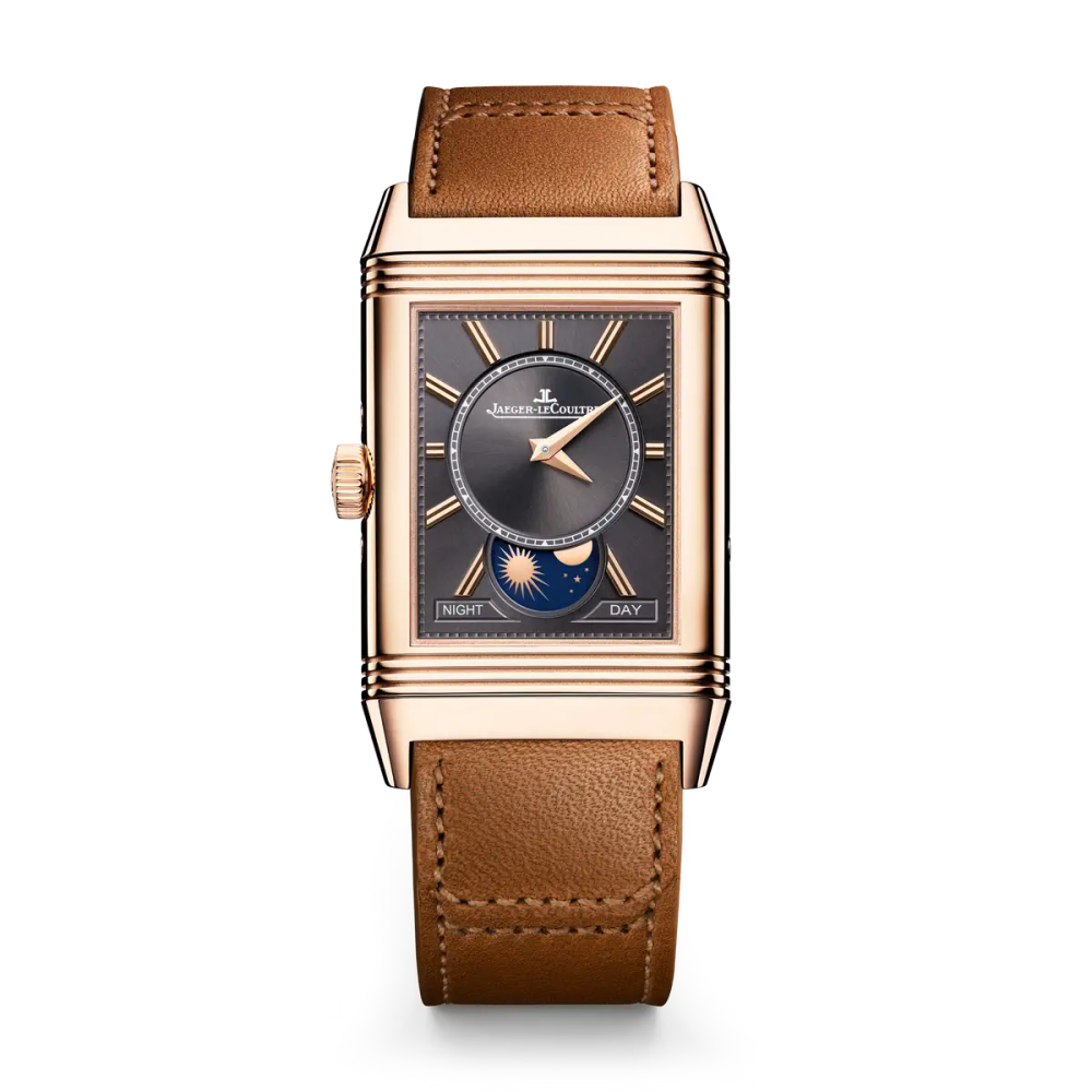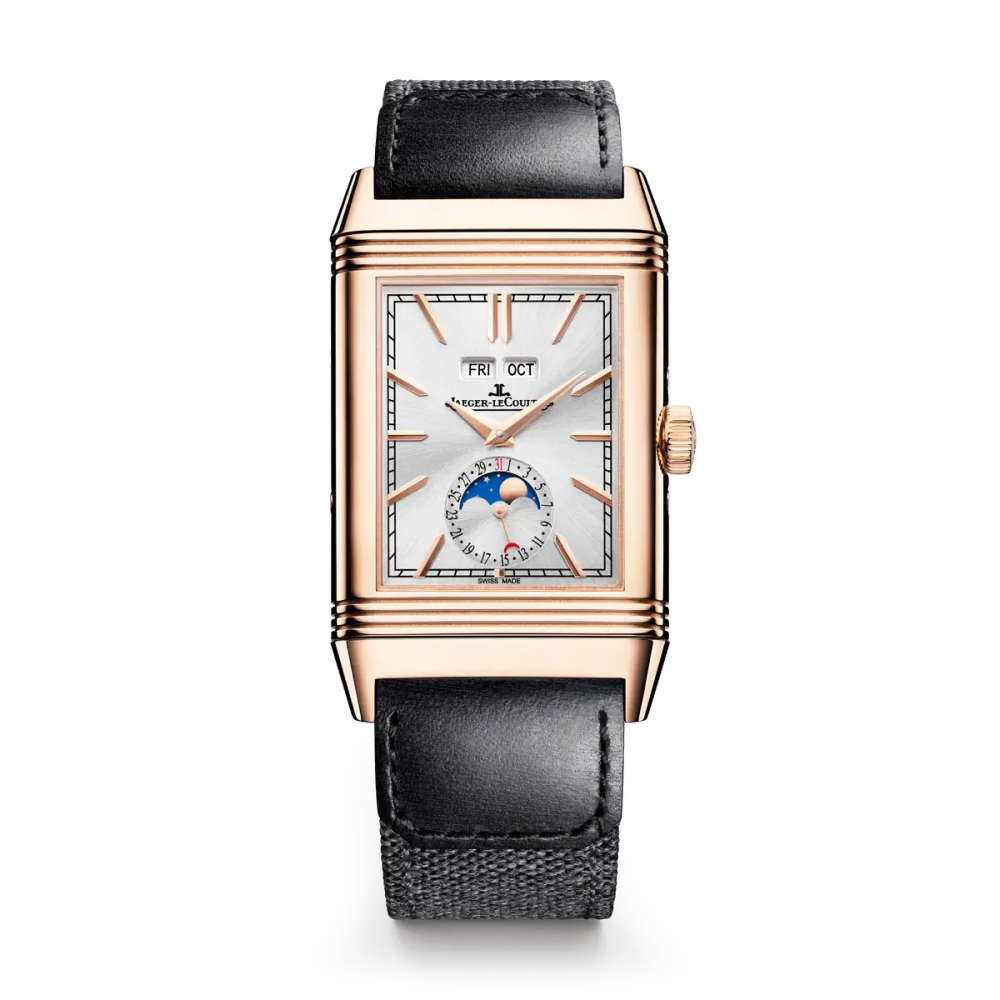 Ausgestattet mit dem Manufakturkaliber 853 mit Handaufzug, das das Duoface mit einem kompletten Kalender kombiniert, bietet die Reverso Tribute Duoface Calendar einen herrlichen Kontrast auf beiden Seiten. Auf der Vorderseite interpretiert die Uhr die ästhetischen Codes der 1931 lancierten, vom Art déco inspirierten Kollektion mit Eleganz und Raffinesse neu: ikonische Gadroons, applizierte Indexe, Dauphine-Zeiger... Die Mondphase bei 6 Uhr wird von einem diskreten Zeiger mit einer leuchtend roten, halbmondförmigen Spitze geschmückt, der das Datum anzeigt. Auf der Rückseite befindet sich ein neues Zifferblatt mit Sonnenschliff in einem bezaubernden Dunkelgrau und einer Nacht/Tag-Scheibe, die sich perfekt in das neue Dekor einfügt. Die elegante und zeitlose Uhr wird mit einem Paar austauschbarer Armbänder (und einer Schließe) geliefert, die von Casa Fagliano entworfen wurden. In Leder oder Doppelmaterial (Stoff und Leder) verleihen sie dem Modell einen starken Vintage-Charakter.