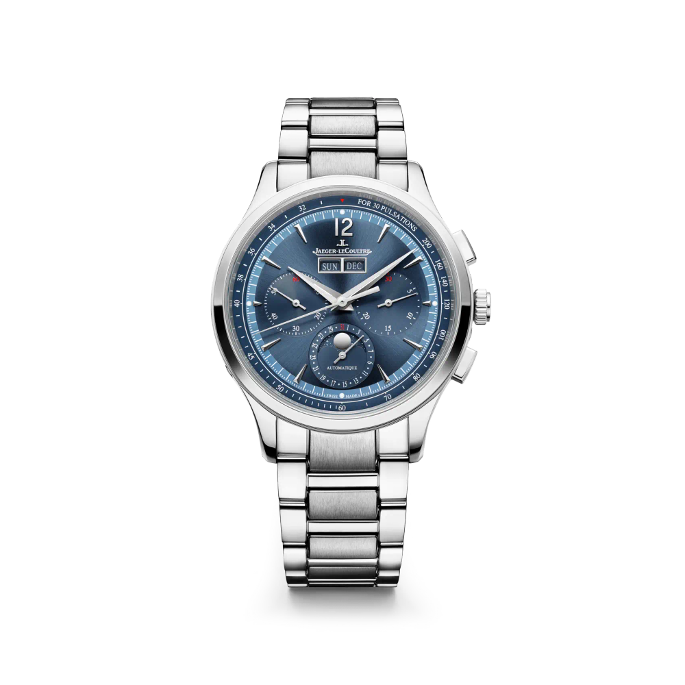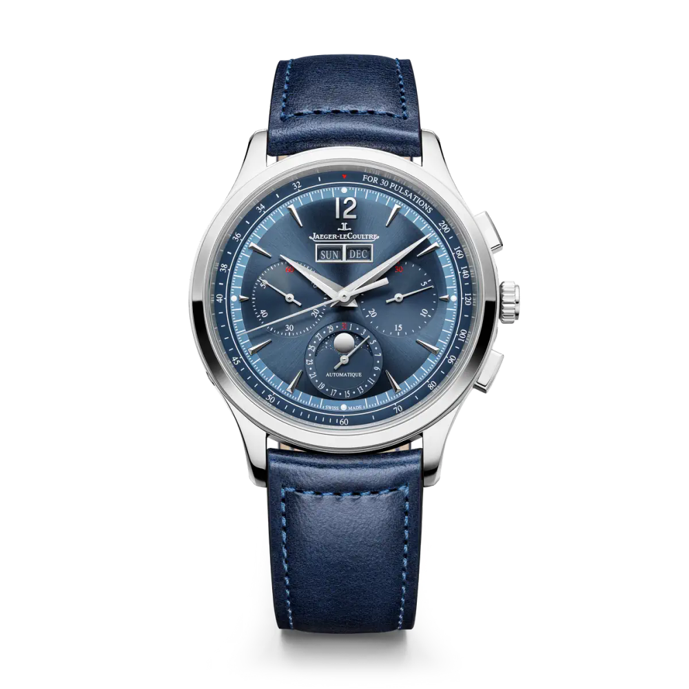 Die Master Control Chronograph Calendar folgt den Traditionen der runden Uhren, die in den 1950er-Jahren äußerst beliebt waren. Das zweifarbige Zifferblatt in einem doppelt gebürsteten und polierten Gehäuse garantiert eine hervorragende Ablesbarkeit der Funktionen (Stunden, Minuten, kleine Sekunden) sowie der Komplikationen, insbesondere des Chronographen mit seiner pulsometrischen Skala und dem 30-Minuten-Zähler. Unter dem Saphirglasboden ist das manufaktureigene Kaliber 759 zu sehen, das eine Gangreserve von 65 Stunden verspricht. Die Master Control Chronograph Calendar wird mit verschiedenen auswechselbaren Armbändern angeboten – eins mit Gliedern aus Edelstahl, das andere aus blauem Leder – so kann ihr Erscheinungsbild mit wenigen Handgriffen verändert werden und sie bleibt immer auf der Höhe der Zeit.