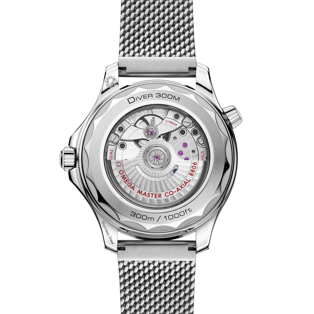 Am Handgelenk gehalten wird die Uhr von einem gebürsteten Milanaise-Armband mit Schließe, für den Antrieb sorgt das OMEGA Co-Axial Master Chronometer Kaliber 8806, das durch den Saphirglasboden bewundert werden kann.