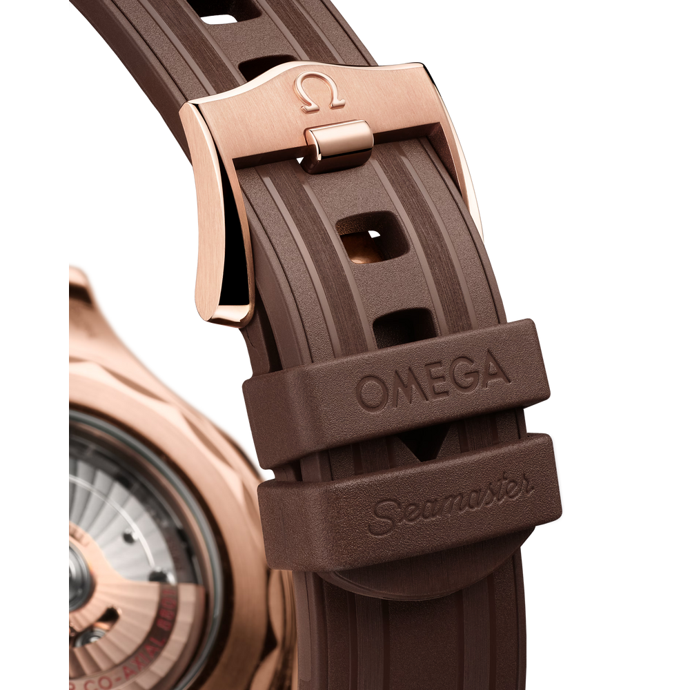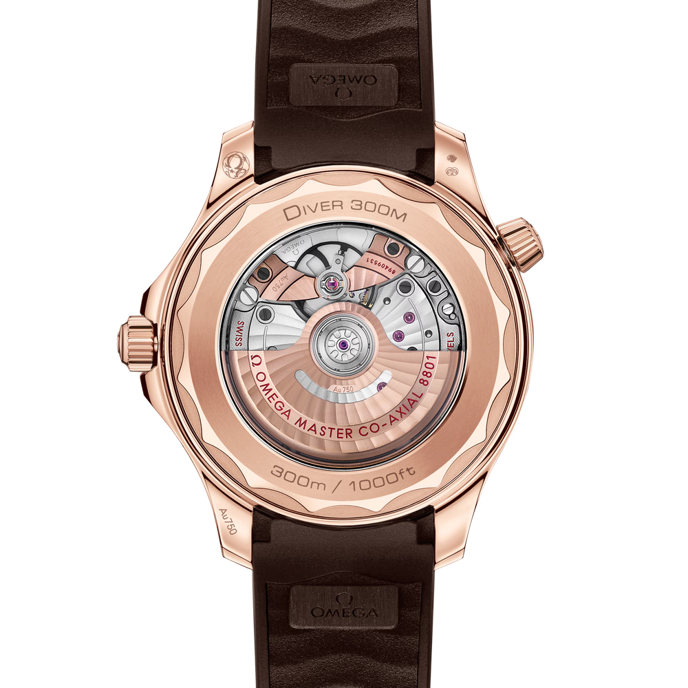 Angetrieben wird die Uhr mit braunem Kautschukarmband von dem OMEGA Master Chronometer Kaliber 8801, das durch das Saphirglas des Gehäusebodens mit gewelltem Rand bewundert werden kann.