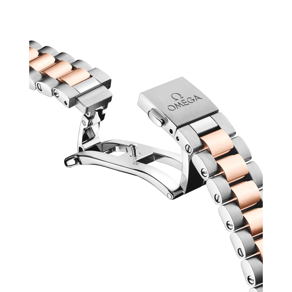 Am Handgelenk gehalten wird die Uhr von einem integrierten Armband aus Edelstahl und 18 K Sedna™-Gold mit schön abgerundeten, polierten und gebürsteten Gliedern, einer Doppelfaltschliesse und dem einfachen Komfortverschluss von OMEGA.