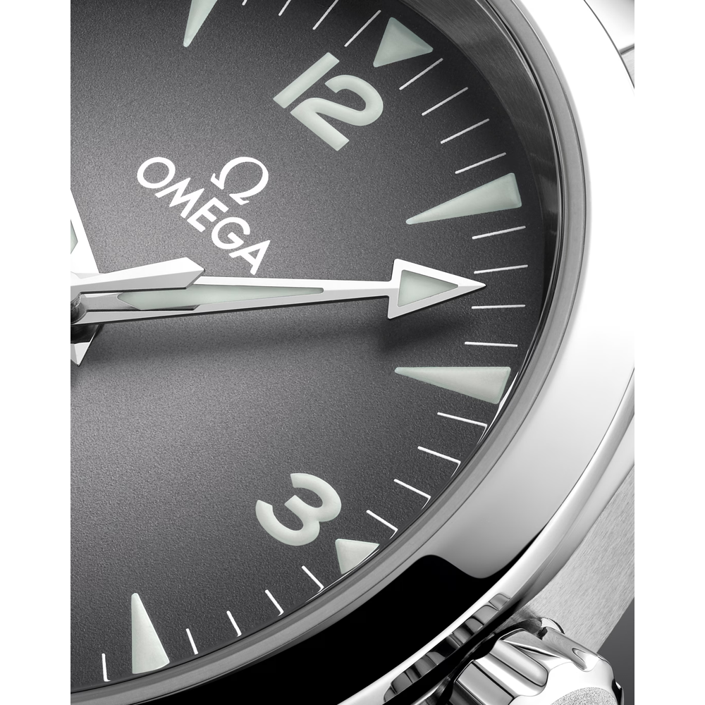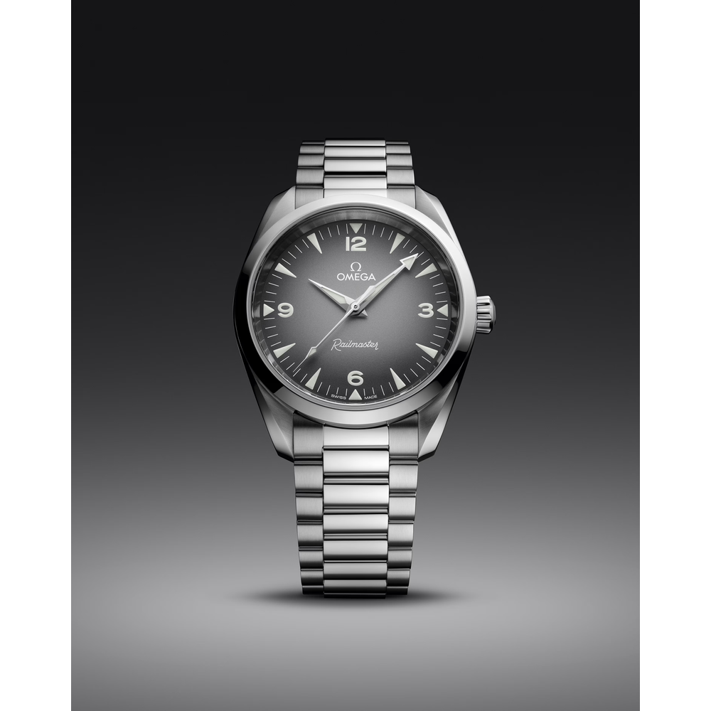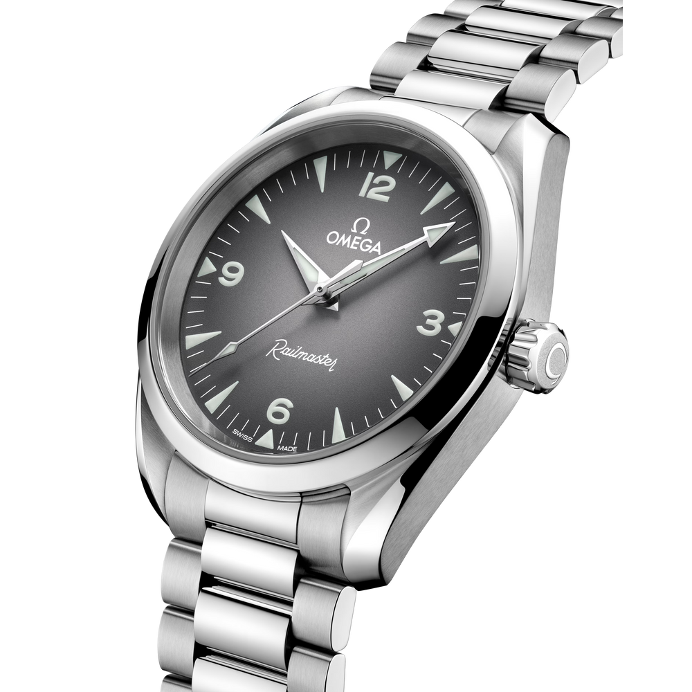 Das symmetrische 38-mm-Gehäuse ist gebürstet und poliert und wird von einem integrierten Armband mit Komfortverschluss sowie gebürsteten und polierten Gliedern am Handgelenk gehalten. In Anlehnung an die gut ablesbare Anzeige der Original Railmaster zeigt sich das Zifferblatt dieses Modells in Grau mit schwarzem Farbverlauf sowie mit großen Ziffern und Stundenindizes in weißer Super-LumiNova.