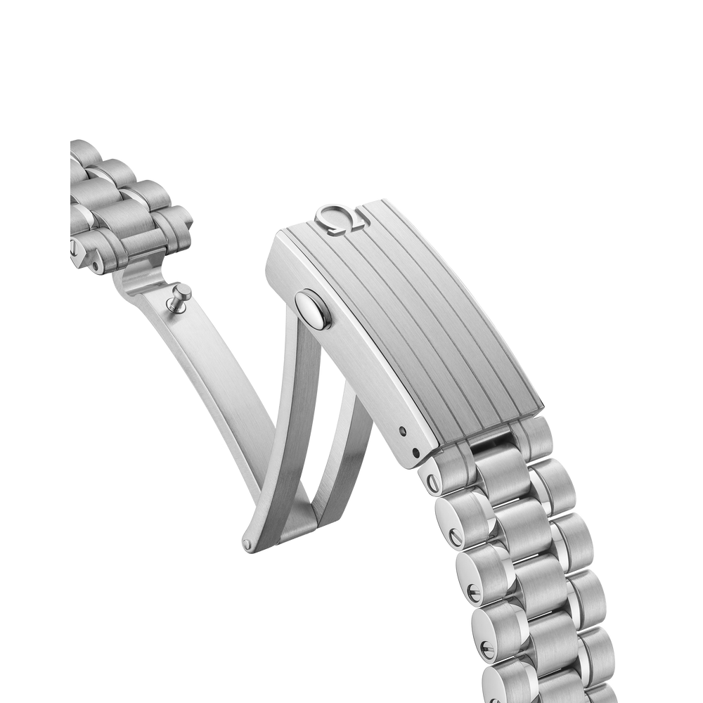 Diese 42-mm-Moonwatch aus Edelstahl wird von einem polierten und gebürsteten Metallarmband am Handgelenk gehalten. Als Uhrglas und Gehäuseboden dient Saphirglas. Inspiriert von der 4. Generation der Speedmaster, die auf dem Mond getragen wurde, besitzt das Modell auch ein asymmetrisches Gehäuse, ein weiß lackiertes, abgestuftes Zifferblatt mit appliziertem OMEGA Logo und applizierten Indizes, Zeiger im Moonwatch-Stil und den berühmten Punkt über der 90 auf dem Lünettenring aus schwarzem, eloxiertem Aluminium.