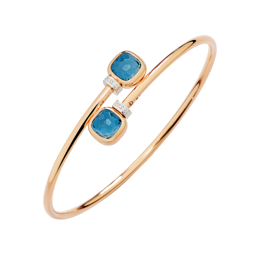 Armreif aus 18 Karat Rosé- und Weißgold mit 2 London Blue Topasen (≈7,4 ct) und 6 weißen Diamanten (≈0,02 ct) auf rhodiniertem 18 Karat Weißgold.