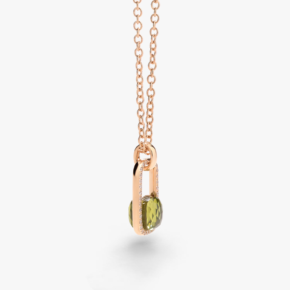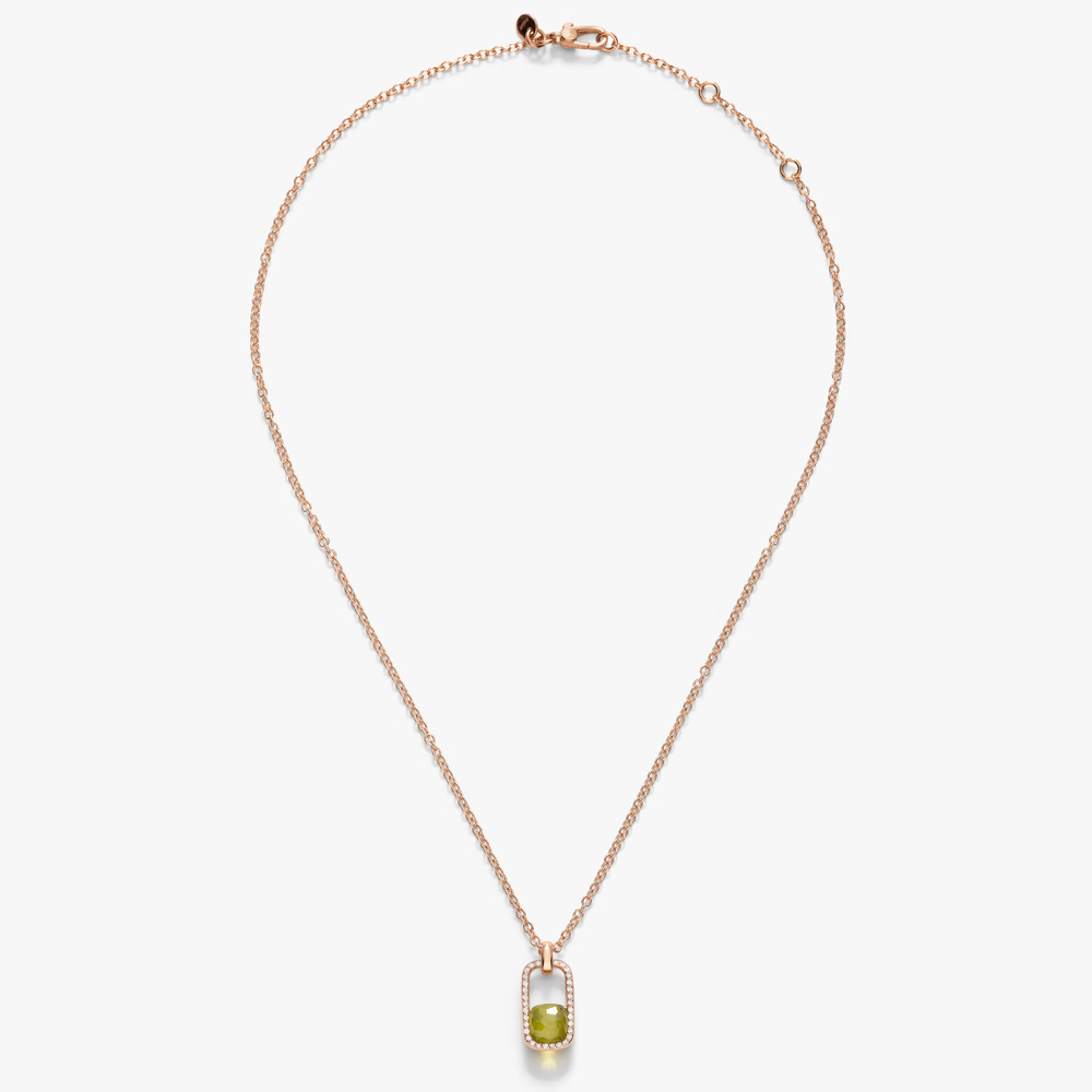 Necklace in 18K rose gold with 1 peridot (≈3.4 cts) and 36 white diamonds (≈0.2 ct).
