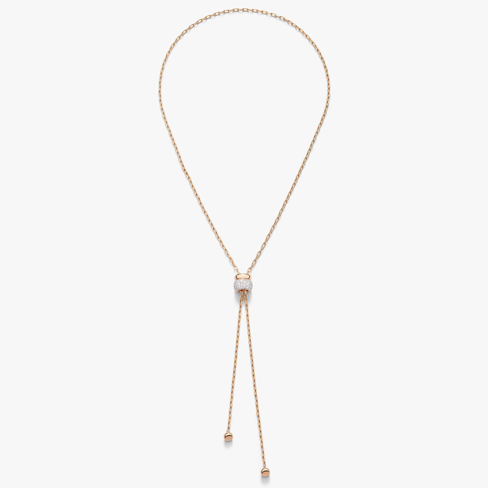 Dieses vielseitige Lariat-Collier, gefertigt aus warmem Roségold und erhellt von weißen Diamanten, setzt mit seinem markanten Mittelmotiv ein ausdrucksstarkes Statement. Inspiriert von der Harmonie zweier Iconica-Ringe, vereint das Collier ein kühnes, mit funkelnden Diamanten besetztes Band mit einem klaren, reinen Roségoldring. Das frei bewegliche Schiebeelement entlang der Kette ermöglicht unzählige Styling-Optionen.