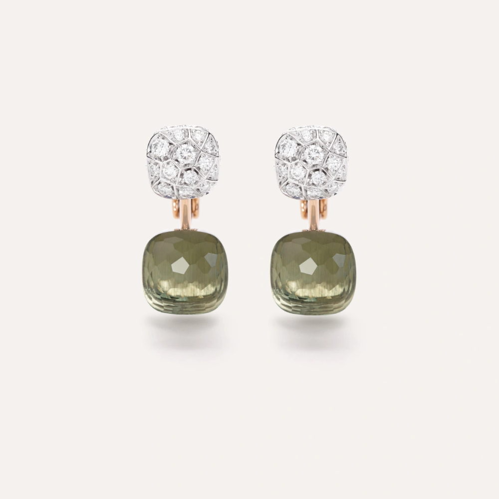 Ohrringe aus 18 Karat Rosé- und Weißgold mit 2 Prasiolithen (≈14 ct) und 76 weißen Diamanten (≈1,5 ct) auf 18 Karat rhodiniertem Weißgold.