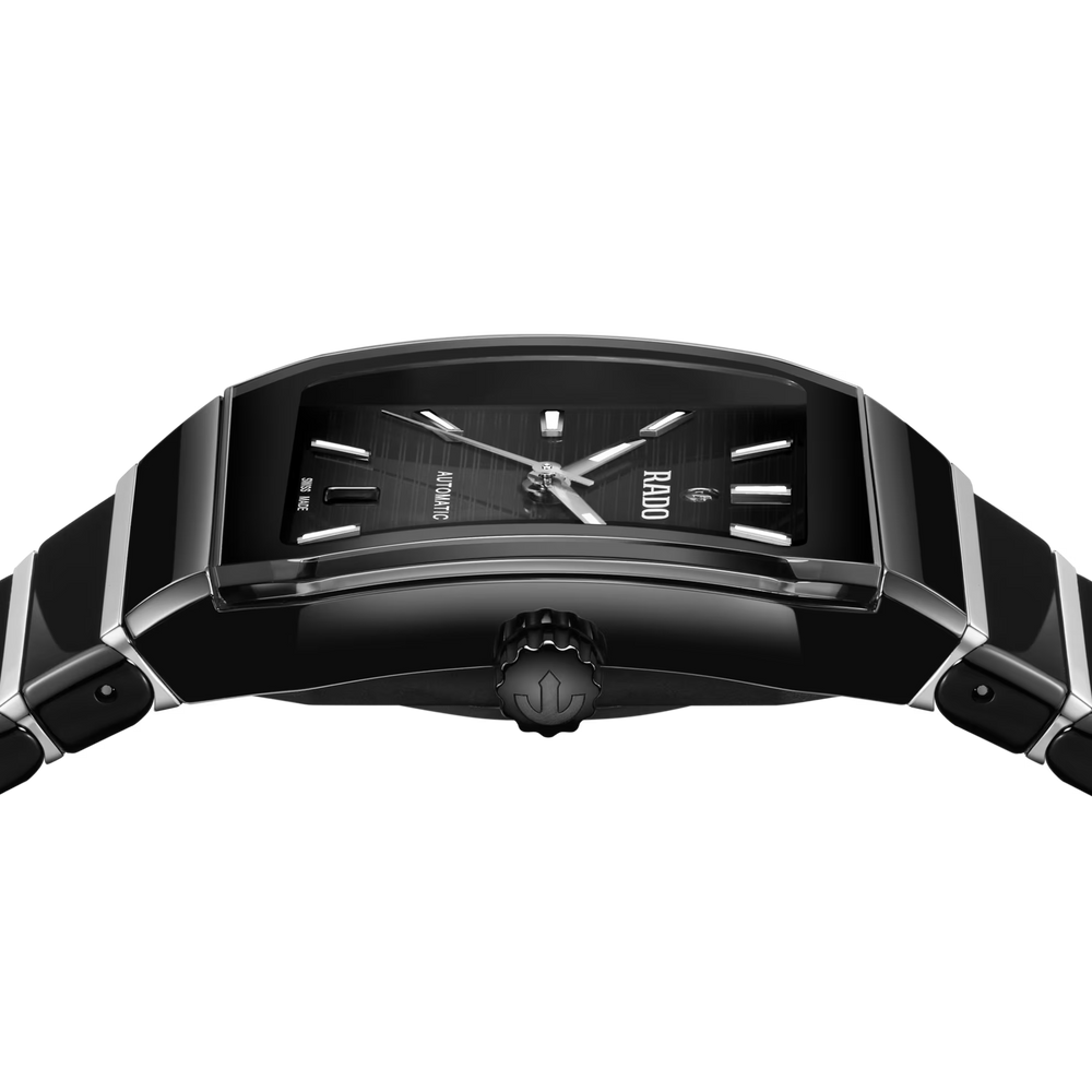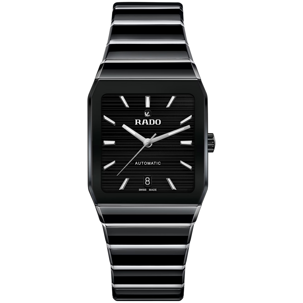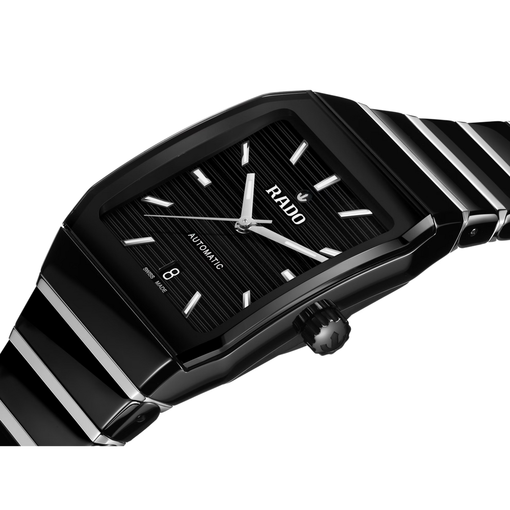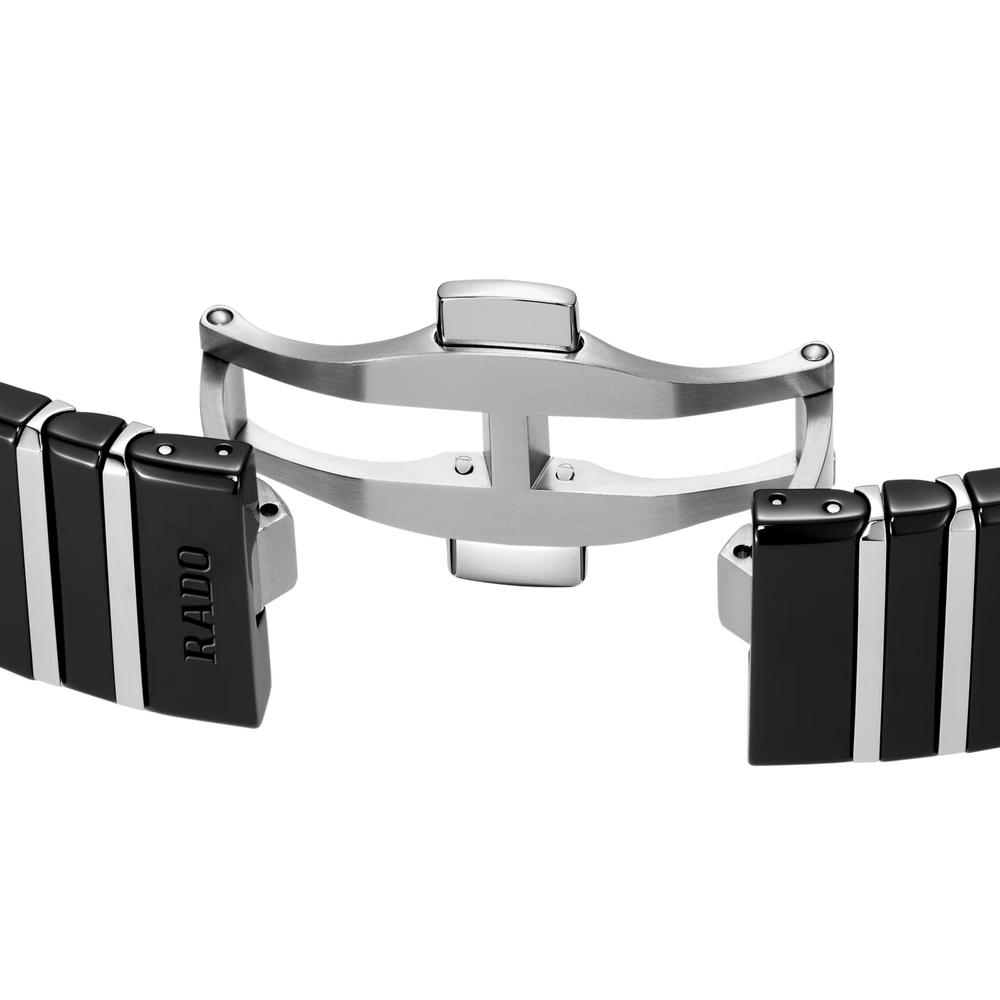 Seit ihrem Debüt im Jahr 1983 ist die Rado Anatom ein Symbol für bahnbrechendes Design und ultimativen Tragekomfort. Ihr charakteristisches Merkmal ist das zylindrische, metallisierte Saphirglas mit facettierten Kanten auf beiden Seiten, das nahtlos in ein Armband aus Hightech-Keramik übergeht und so eine glatte, durchgehende Form schafft, die Gehäuse und Armband zu einer geschlossenen Einheit verschmelzen lässt. Das aus polierter schwarzer Hightech-Keramik und polierten Edelstahl-Mittelgliedern gefertigte Armband wird durch eine Dreifachschliesse aus gebürstetem Edelstahl sorgfältig gesichert.