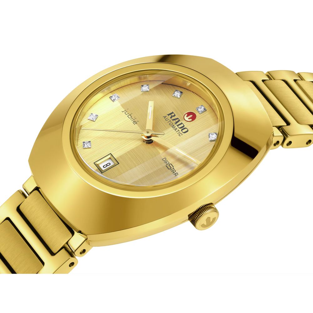 Ein legendäres Symbol für Schweizer Handwerkskunst und bahnbrechende Innovation: Die Rado Diastar wurde für TrägerInnen entworfen, die das Extraordinäre schätzen. Das 30 mm grosse Gehäuse wird von einer Lünette aus poliertem gelbgoldfarbenen Ceramos™ gekrönt. Es geht nahtlos in ein Mittelgehäuse aus poliertem gelbgoldfarbenen PVD-Edelstahl über und ist bis zu 10 bar (100 Meter) wasserdicht. Das gelbe, in zwei Richtungen gebürstete Zifferblatt ist mit 11 Top Wesselton Vollschliff-Diamanten versehen, die das Licht elegant einfangen. In seiner Mitte kann der ikonische, goldfarbene bewegliche Anker bewundert werden, der durch ein präzise platziertes Datumsfenster bei 6 Uhr komplementiert wird. Goldfarbene Zeiger mit weissem Super-LumiNova® sorgen für eine jederzeit perfekte Ablesbarkeit. Geschützt wird das raffinierte Zifferblatt durch ein vertikal facettiertes Saphirglas mit Antireflexionsbeschichtung auf der Innenseite. Herzstück der Uhr ist das Automatikwerk Kaliber R586. Das in fünf Lagen fein justierte Uhrwerk ist mit einer Nivachron™ Spiralfeder ausgestattet und bietet eine hohe Ganggenauigkeit sowie eine Gangreserve von 48 Stunden. Abgerundet wird das Design dieses legendären Zeitmessers durch ein Armband aus gelbgoldfarbenem PVD-Edelstahl, das polierte Glieder und satinierte Mittelglieder miteinander kombiniert und durch eine Dreifach-Faltschliesse aus poliertem gelbgoldfarbenen PVD-Edelstahl am Handgelenk gesichert wird.