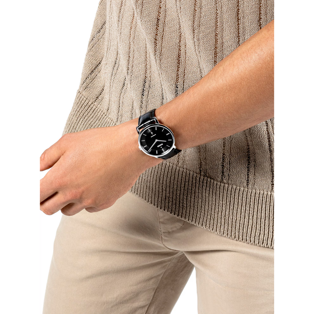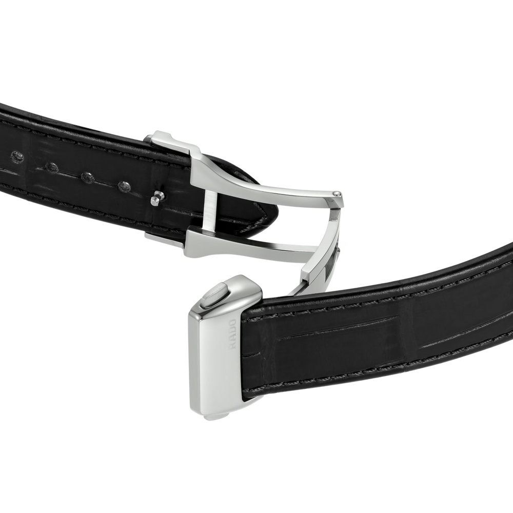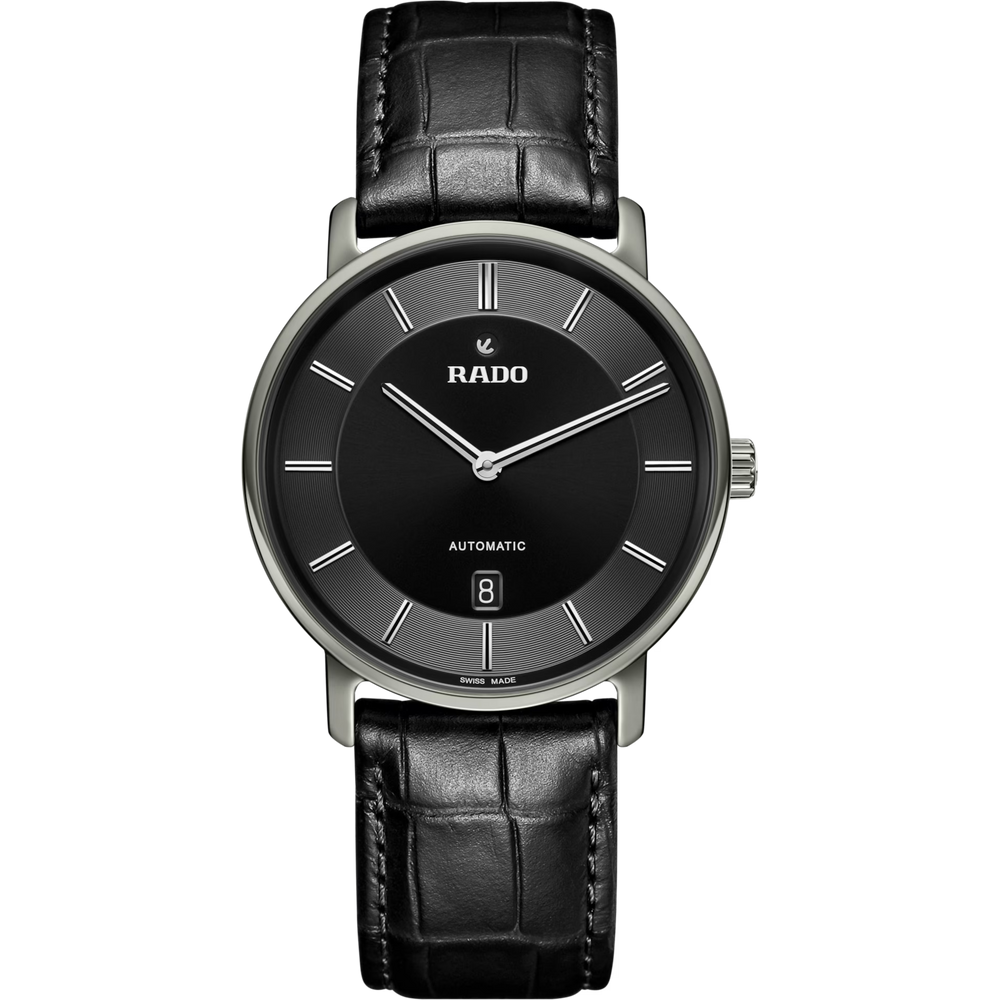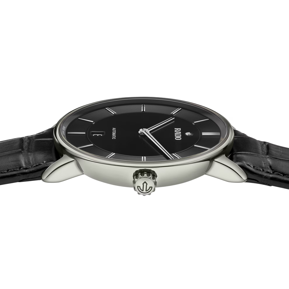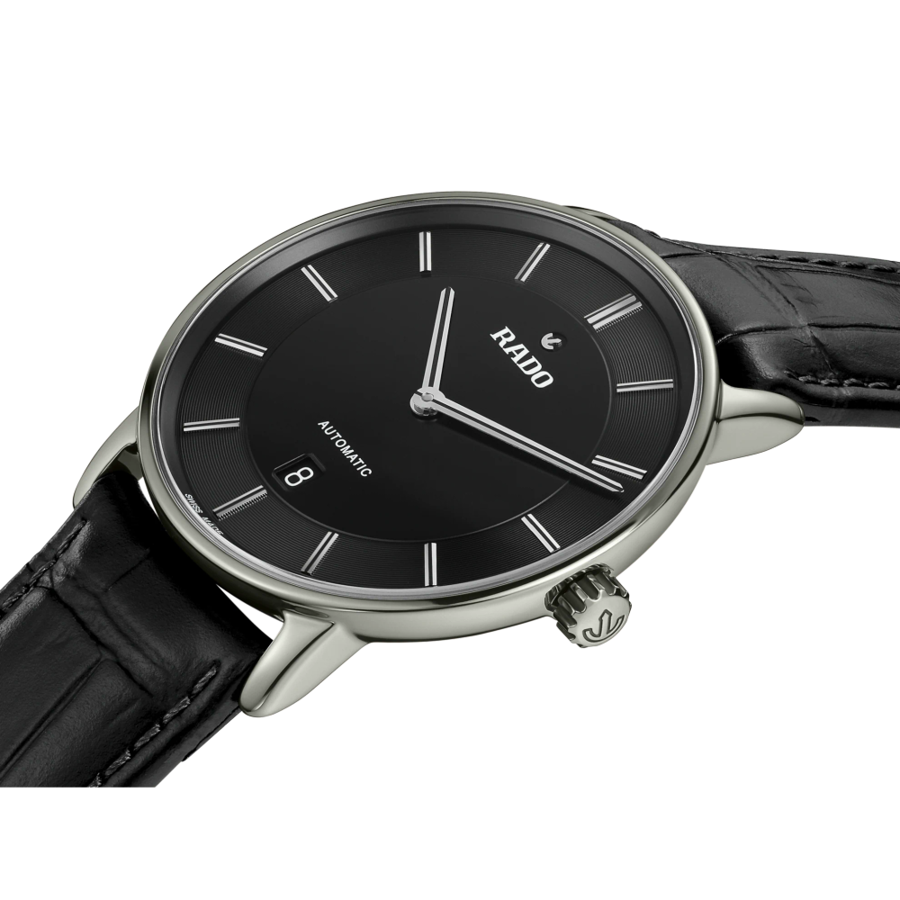 Wir stellen vor: die Rado DiaMaster Thinline Automatic Bei diesem von einem Rado Automatikwerk R766 angetriebenen Modell werden Tradition und Innovation nahtlos miteinander vereint. Dank einer beeindruckenden Gangreserve von 72 Stunden verfügt diese Uhr zudem über eine garantiert lange Laufzeit. Das 41 mm grosse Gehäuse der DiaMaster Thinline Automatic aus poliertem, platinfarbenem Ceramos™ zeichnet sich durch seine äusserst solide Monobloc-Konstruktion aus. Der aufgepresste Gehäuseboden aus Titan ist mit einem Saphirglas ausgestattet und sorgt damit für einen Hauch von Raffinesse. Das schwarze Zifferblatt – akzentuiert mit rhodiumfarbenen applizierten Indizes mit schwarzer Einlage – bezaubert mit seinem Wechselspiel aus Licht und Schatten. Für eine ausgezeichnete Lesbarkeit sorgen die rhodiumfarbenen Zeiger, ebenfalls mit schwarzer Einlage. Gleichzeitig verleihen die Zeiger dem Modell einen Hauch von Luxus. Abgerundet wird das Ensemble durch ein schwarzes Lederarmband mit einer Schliessenabdeckung aus poliertem, platinfarbenem Ceramos™, das sowohl Raffinesse als auch Komfort ausstrahlt.