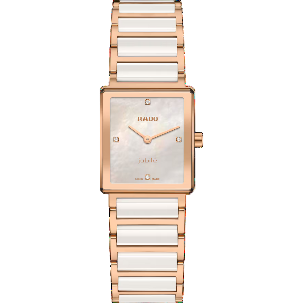 Ein Blick genügt, um die Rado Integral zu erkennen: ikonisches Design, ein puristisches Zifferblatt und ein schlankes, rechteckiges Gehäuse aus poliertem roségoldfarbenen PVD-Edelstahl. Und doch hebt sich dieses Modell durch sein schimmerndes Perlmuttzifferblatt, roségoldfarbene Zeiger und eine roségoldfarbene Metallisierung deutlich hervor.