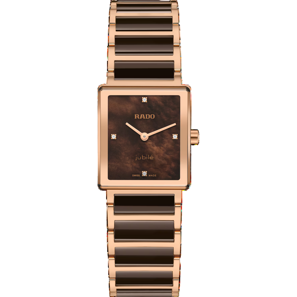 Schon auf den ersten Blick überzeugen das Rado Zifferblatt mit vier Diamanten, die roségoldene Farbgebung und die Glieder aus Hightech-Keramik. Eine klassische Rado Integral. Bei genauerem Betrachten des Zifferblatts zeigt sich das sanfte Schimmern von braunem Perlmutt. Aussergewöhnlich. Faszinierend. Elegant.