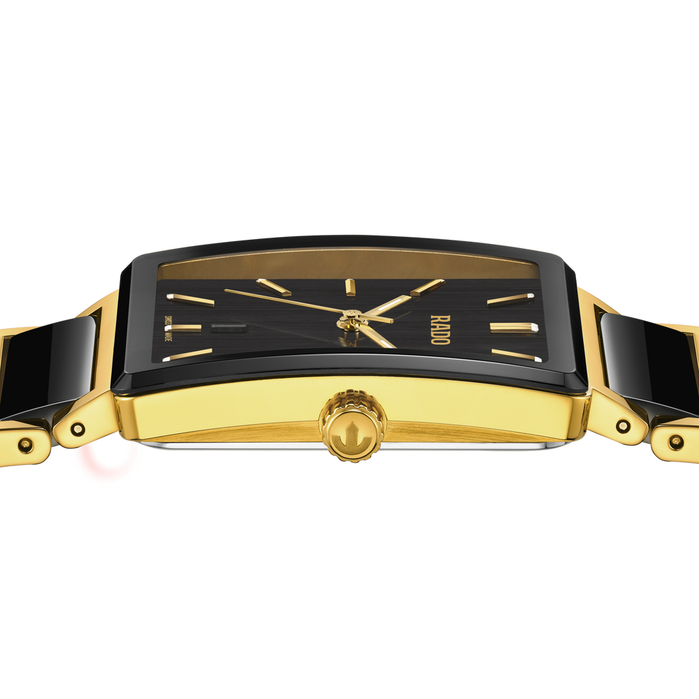 Die Integral verfügt über ein leicht verjüngtes Armband aus poliertem gelbgoldfarbenen PVD-Edelstahl mit Mittelgliedern aus polierter schwarzer Hightech-Keramik, das perfekt zu den eleganten Proportionen des ikonischen quadratischen Gehäuses passt. Das gewölbte Glas ist auf die Wölbung Ihres Handgelenks abgestimmt und der unumstössliche Beweis für Ihren ausgeprägten Sinn für zeitlosen Stil.